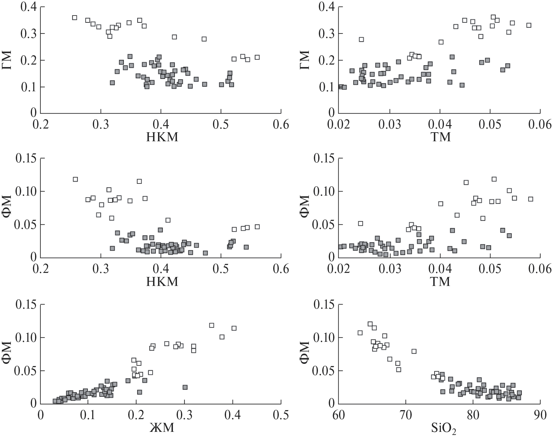 На всех приведенных модульных диаграммах [Юдович, Кетрис, 2000] (рис. 6) фигуративные точки песчаных и глинисто-алевритовых пород решетниковской свиты образуют два самостоятельных, достаточно хорошо разделяющиеся поля, что, очевидно, связано с меньшим содержанием в них кварца, полевых шпатов и обломков кислых изверженных пород, но большим – глинистого вещества. Анализ полученных величин литохимических модулей, а также положения их фигуративных точек на модульных диаграммах (см. рис. 6) позволяет сделать вывод о генетическом типе терригенных пород свиты [Юдович, Кетрис, 2000]. Наблюдающаяся на диаграммах положительная корреляция между парами ГМ–ТМ, ФМ–ТМ и ФМ–ЖМ, но отрицательная между ГМ–НКМ, ФМ–НКМ и ФМ–SiO2 свидетельствует о петрогенной природе отложений, прошедших один цикл переотложения и формировавшихся без существенной литодинамической переработки и сортировки обломочного материала.