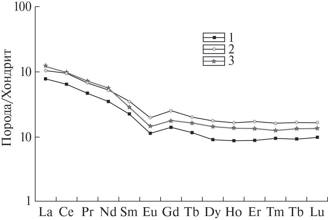 Заметную помощь в решении задачи выяснения породного состава источников питания и определения геодинамической обстановки осадконакопления оказывает изучение концентраций и особенностей распределения в терригенных породах редких и редкоземельных элементов (РЗЭ). По содержанию и характеру их распределения песчаные и глинисто-алевритовые породы решетниковской свиты достаточно близки (табл. 2). Суммарные содержания РЗЭ в песчаниках относительно невелики и варьируют от 90 до 179 г/т. Спектры их распределения, нормализованные к составу хондрита (рис. 7) [Boynton, 1984], во всех изученных пробах однотипны и характеризуются нормальными трендами распределения с умеренной степенью фракционирования и сравнительно невысоким отношением легких лантаноидов к тяжелым (LaN/YbN от 4.61 до 13.66). Помимо этого спектры характеризуются хорошо выраженной отрицательной европиевой аномалией (Eu/Eu* от 0.48 до 0.79). По сравнению с постархейским австралийским средним глинистым сланцем (PAAS), принятым за средний состав верхней континентальной коры [Тейлор, Мак-Леннан, 1988], породы незначительно обединены всеми элементами (в 2.4 раза) и лишь в отдельных пробах Sm, Eu и Gd находятся в близких либо незначительно более высоких концентрациях. В глинисто-алевритовых породах суммарный уровень концентрации РЗЭ несколько выше, чем в песчаниках и изменяется в пределах от 75 до 229 г/т (см. табл. 2). Вместе с тем общий характер их распределения (см. рис. 7) в целом близок, отличаясь лишь более низким отношением легких РЗЭ к тяжелым (LaNYbN от 4.00 до 8.50), при этом величина отрицательной европиевой аномалии у них одинаковая (Eu/Eu* 0.49–0.79). Сравнение с PAAS показывает незначительную обогащенность глинисто-алевритовых пород практически всеми элементами (почти в 2 раза), и лишь некоторые легкие элементы (La, Ce, Pr и Nd) часто находятся в несколько меньших количествах.