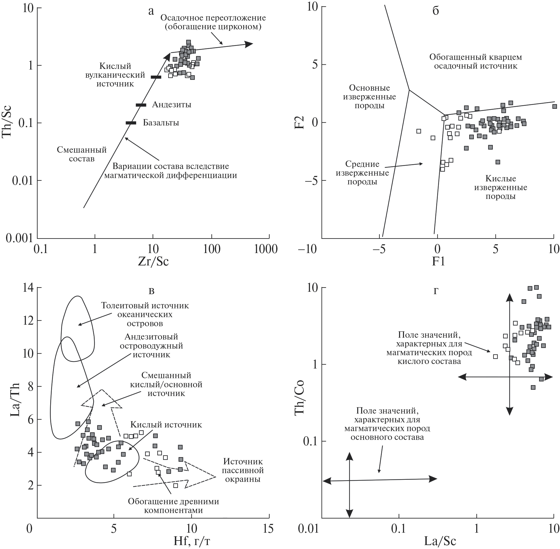 Палеогеодинамическая интерпретация геохимического состава терригенных пород решетниковской свиты осуществлена с использованием серии дискриминантных диаграмм, приведенных на рис. 13. На диаграммах М. Бхатия и А. Крука [Bhatia, 1983; Bhatia, Crook, 1986] (см. рис. 13а–13ж), применяющихся для разграничения песчаных и глинисто-алевритовых пород из бассейнов различных тектонических обстановок, фигуративные точки изученных пород приближаются к полям бассейнов пассивных континентальных окраин либо попадают на эти поля. Еще более однозначно обстановки пассивных окраин устанавливаются на диаграмме Si2O–K2O/Na2O Б. Розера и К. Корша [Roser, Korsch, 1986] (см. рис. 13з), на которой уже все точки состава песчаных и большинства глинисто-алевритовых пород компактно группируются в поле бассейнов, связанных с этой геодинамической обстановкой. На диаграмме DF1–DF2, предназначенной для интерпретации состава пород с высоким содержанием кремнезема (более 63%) [Verma, Armstrong-Altrin, 2013] (см. рис. 13и), точки ложатся в поле бассейнов, связанных с рифтогенными обстановками. В целом же генетическая интерпретация геохимического состава терригенных пород решетниковской свиты свидетельствует об их формировании в геодинамических обстановках, соответствующих бассейнам пассивных континентальных окраин, к которым относятся внутри- и межконтинентальные рифты и авлакогены.