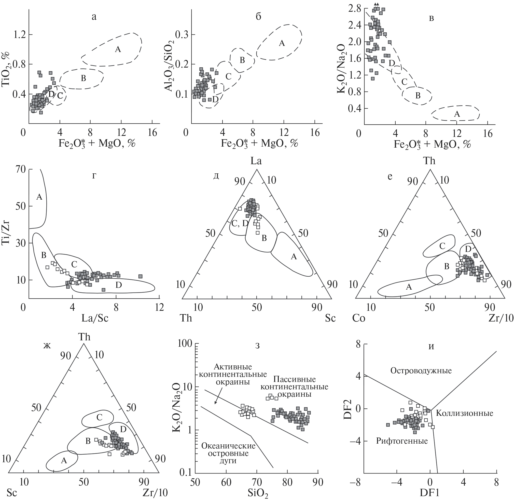 а–ж – типы седиментационных бассейнов [Bhatia, 1983; Bhatia, Crook, 1986]. Поля значений геохимических параметров древних песчаников из бассейнов, сопряженных: А – с океаническими, В – с континентальными островными дугами, С – с активными, D – с пассивными континентальными окраинами. Fe2O3* – общее железо; з – бассейновые обстановки [Roser, Korsch, 1986]; и – возможные типы геодинамических обстановок для высококремнистых пород DF1–DF2 [Verma, Armstrong-Altrin, 2013].