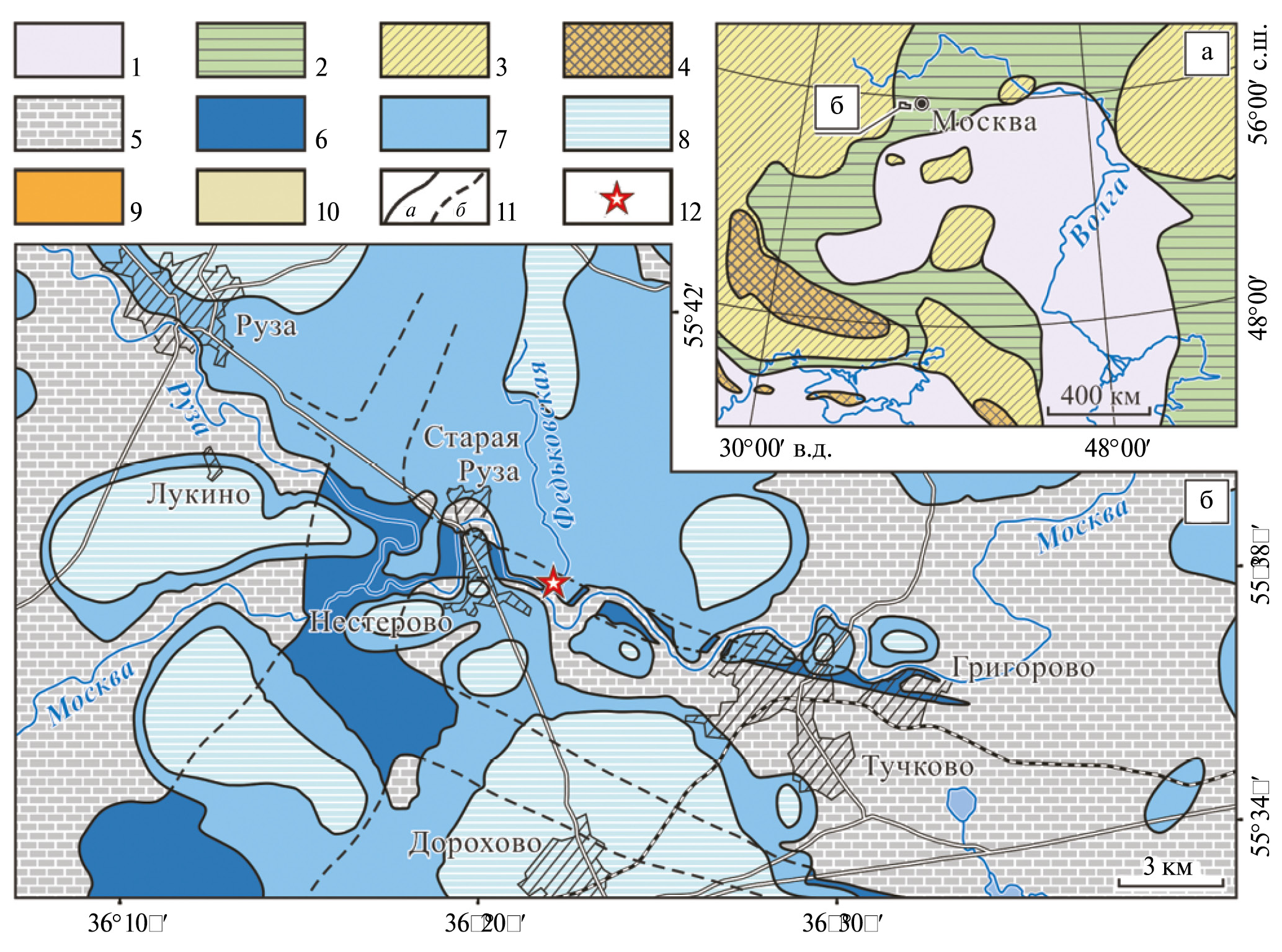 Рис. 1. Палеогеографическая схема юго-западной части Восточно-Европейской платформы для байосского‒батского веков юрского периода (составлена по данным [Атлас, 1968] с изменениями) (а) и схема геологического строения нижнего течения р. Руза (составлена по данным [Лачинова и др., 1999] с изменениями) (б).