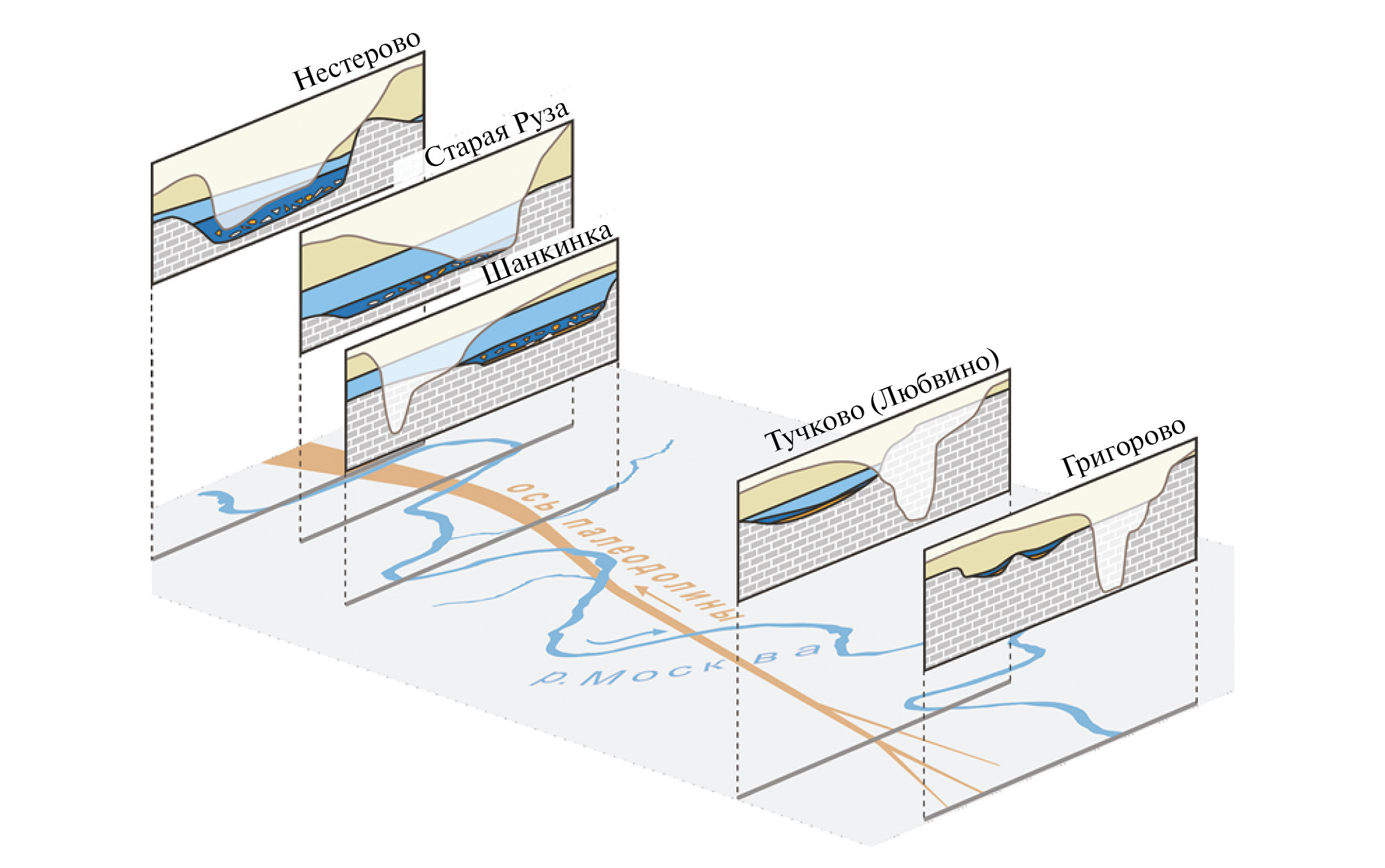 Рис. 2. Внемасштабная схема поперечного строения палеодолины Григорово–Нестерово и ее взаимоотношений с вмещающими и перекрывающими осадочными комплексами.