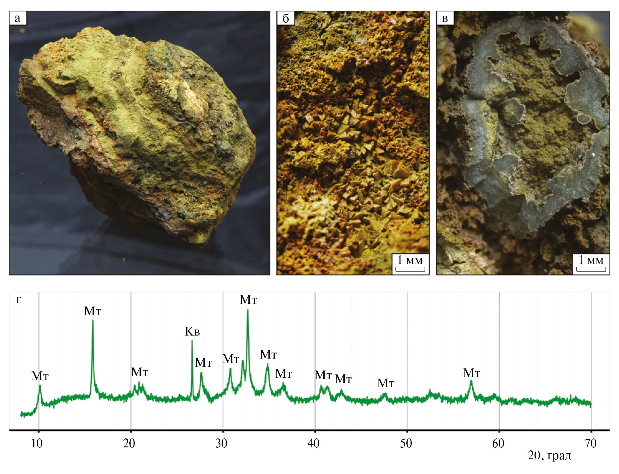 а – полосчатый агрегат, с чередованием зон более плотного (темнее) и рыхлого (светлее) скрытокристаллического грязно-зеленого митридатита, штуф 10×9×9 см; б – последовательная псевдоморфоза митридатита по гетиту, ранее заместившему крупнокристаллический сидерит; в – микрокристаллическая корка митридатита, выстилающая полость в нодуле дельвоксита; г – типичная дифрактограмма скрытокристаллического агрегата митридатита (Мт – митридатит, Кв – кварц)