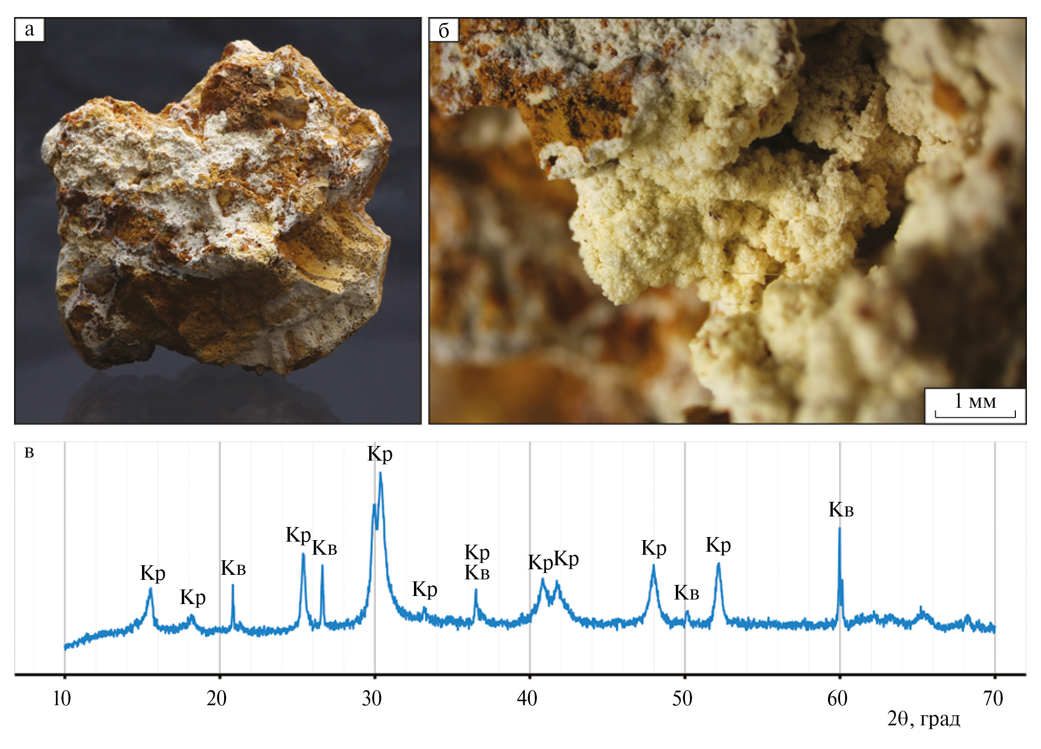 а – белый скрытокристаллический крандаллит, цементирующий брекчию фосфатизированного оолитового сидеритолита, штуф 6×6×4 см; б – гроздевидные агрегаты богатого стронцием микрокристаллического крандаллита в полостях брекчированных пород; в – типичная дифрактограмма крандаллитового цемента из нижней части линзы фосфатизированных сидеритолитов (Кр – крандаллит, Кв – кварц)