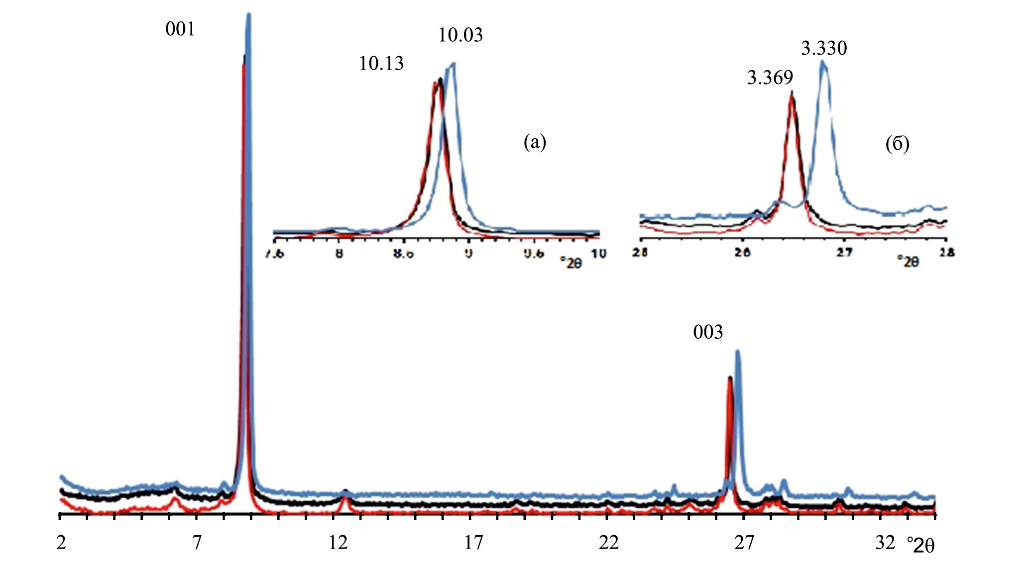 Рис. 1. Экспериментальные дифракционные картины, полученные от ориентированных препаратов, приготовленных из фракции <1 мк образца 3081 в воздушно-сухом (красная линия), насыщенном этиленгликолем (черная линия) и прокаленном при 550°С (синяя линия) состояниях. На врезках в увеличенном масштабе показаны фрагменты дифрактограмм с отражениями 001 (а) и 003 (б).