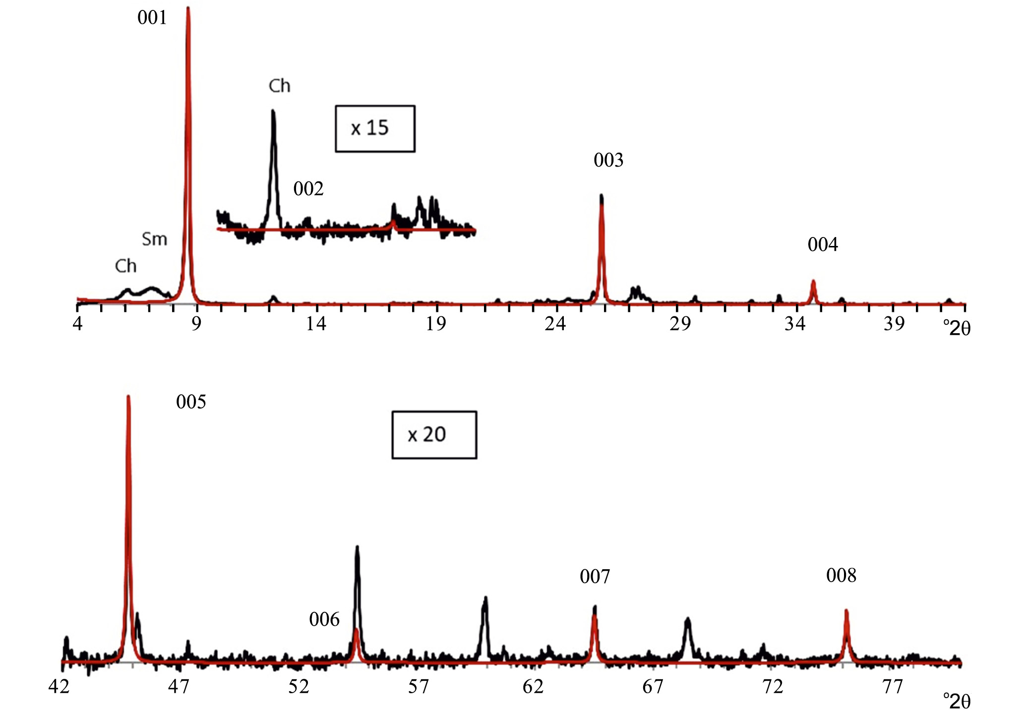 Рис. 2. Экспериментальная (черная линия) и рассчитанная (красная линия) дифракрограммы для ориентированного препарата образца 3081, фракция <1 мк; Ch – хлорит, Sm – смектит. На врезке показаны фрагменты дифракрограмм в увеличенном масштабе для рефлекса 002.