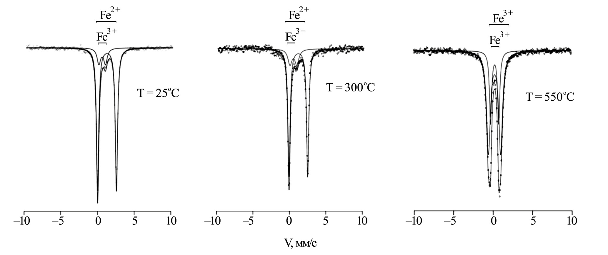 Рис. 4. Мёссбауэровские спектры, полученные от биотита (обр. 3081, фракция <1 мк) в природном состоянии (Т = 25°С), после нагревания при Т = 300°С и Т = 550°С и результаты разложения спектров.