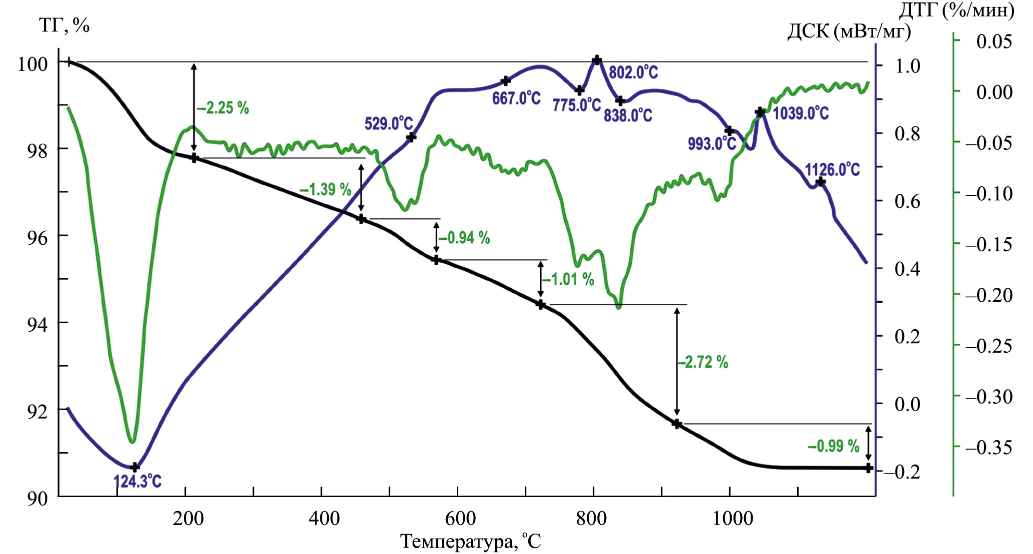 На рис. 5 приведены термические кривые ТГ (термогравиметрическая кривая потери веса), ДСК (кривая дифференциальной сканирующей калориметрии) и ДТГ (дифференциальная термогравиметрическая кривая потери веса) образца 3081. В диапазоне от 25 до 1200°С происходит потеря массы образца на 9.33%, наиболее интенсивные потери сопровождаются эндотермическими эффектами около 100, 500 и 800°С. Первая, низкотемпературная ступень, происходит в интервале 25–200°C и связана с удалением адсорбированной воды. Вторая ступень начинается при нагревании около 400°C и, видимо, связана с процессами дегидрирования, при которых потери массы значительно меньше, чем на третей ступени (600–840°C), связанной с разрушением структурных гидроокислов (дегидроксилация). Этот результат согласуется с данными [Földvári, 2011], согласно которым триоктаэдрические слюды практически не имеют термических реакций ниже 1000°С, а небольшие модуляции на кривых ДСК и ДТГ связаны скорее всего с присутствием в образце примесей смектита (~4%) и хлорита (~9%). Процесс дегидрирования (вторая ступень) сопровождается окислением двухвалентного железа, что подтверждается данными мёссбауэровской спектроскопии, где было показано, что после нагрева образца до 550°C в спектре не фиксируется дублетов двухвалентного железа.