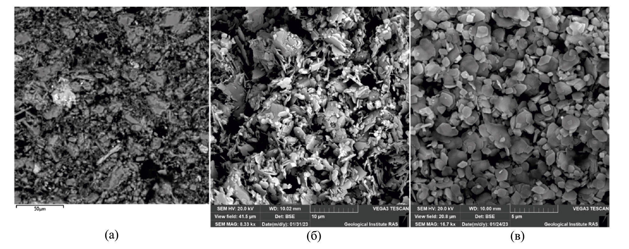 Рис. 6. Микрофотографии обр. 3081: шлиф (а), скол консолидированного образца (б), фракция <1 мк (в).
