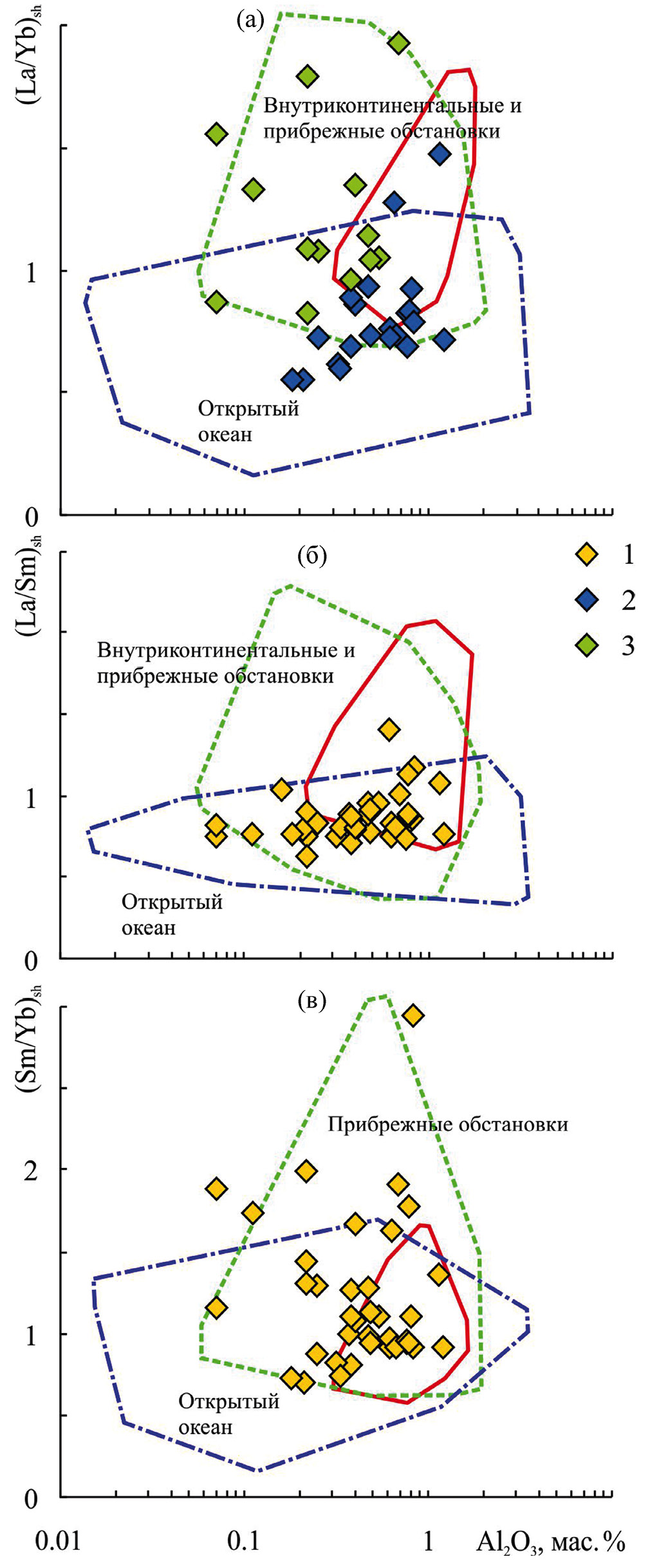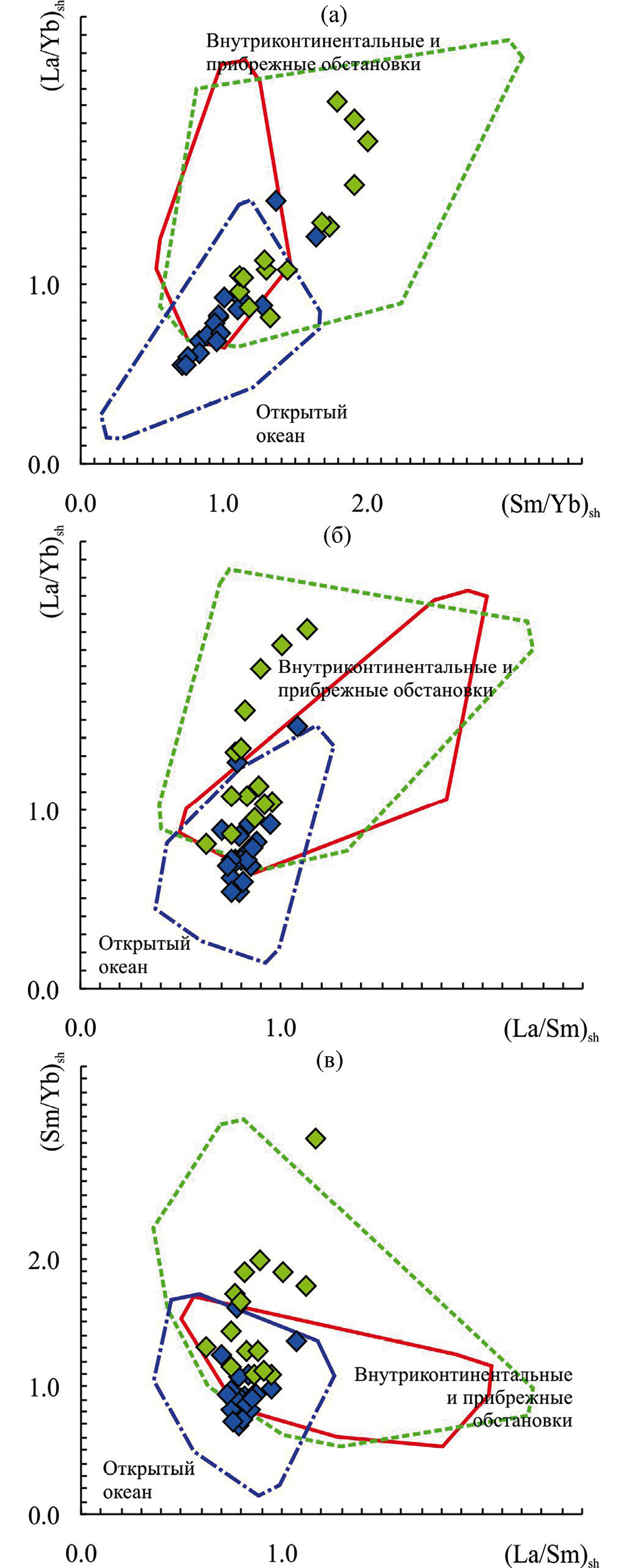 Вследствие того, что укским известнякам среднего рампа свойственны более низкие в целом значения отношений (Sm/Yb)sh и (La/Yb)sh, чем те, что характерны для известняков этой же свиты, формировавшихся в обстановках внутреннего и верхов среднего рампа, тенденция к разграничению фигуративных точек указанных фаций выражена на диаграмме (Sm/Yb)sh–(La/Yb)sh весьма отчетливо (рис. 9а). В то же время, средние значения параметра (La/Sm)sh для тех и других статистически сопоставимы (соответственно 0.82 ± 0.08 и 0.88 ± 0.14) и обозначенная выше тенденция проявлена на графиках (La/Sm)sh–(La/Yb)sh и (La/Sm)sh–(Sm/Yb)sh менее ярко (см. рис. 9б, 9в).