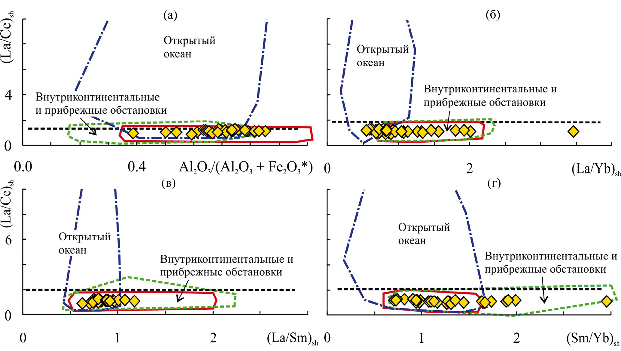 Выше мы уже отмечали, что по данным работы [Zhang et al., 2017], известняки пресноводных обстановок характеризуются средним значением (La/Ce)sh 1.09 ± 0.04. Для известняков прибрежных обстановок средняя величина (La/Ce)sh изменяется от 1.21 ± 0.25 до 3.34 ± 4.05, а известняки открытого океана обладают средней величиной (La/Ce)sh 6.07 ± 5.06. Выборка известняков укской свиты характеризуется средним значением (La/Ce)sh 1.13 ± 0.10 и соответственно на всех диаграммах с участием данного параметра, таких как Al2O3/(Al2O3 + Fe2O3*)–(La/Ce)sh, (La/Yb)sh–(La/Ce)sh, (La/Sm)sh–(La/Ce)sh и др., фигуративные точки известняков данной литостратиграфической единицы располагаются в основном в полях значений, характерных для пресноводных и прибрежных известняков (рис. 7). Такое их распределение согласуется с низкими значениями (La/Ce)sh в морских хемогенных отложениях докембрия, так как недостаток (отрицательная аномалия) церия, в отличие от постдевонских карбонатов, для них характерен не был (см. выше).