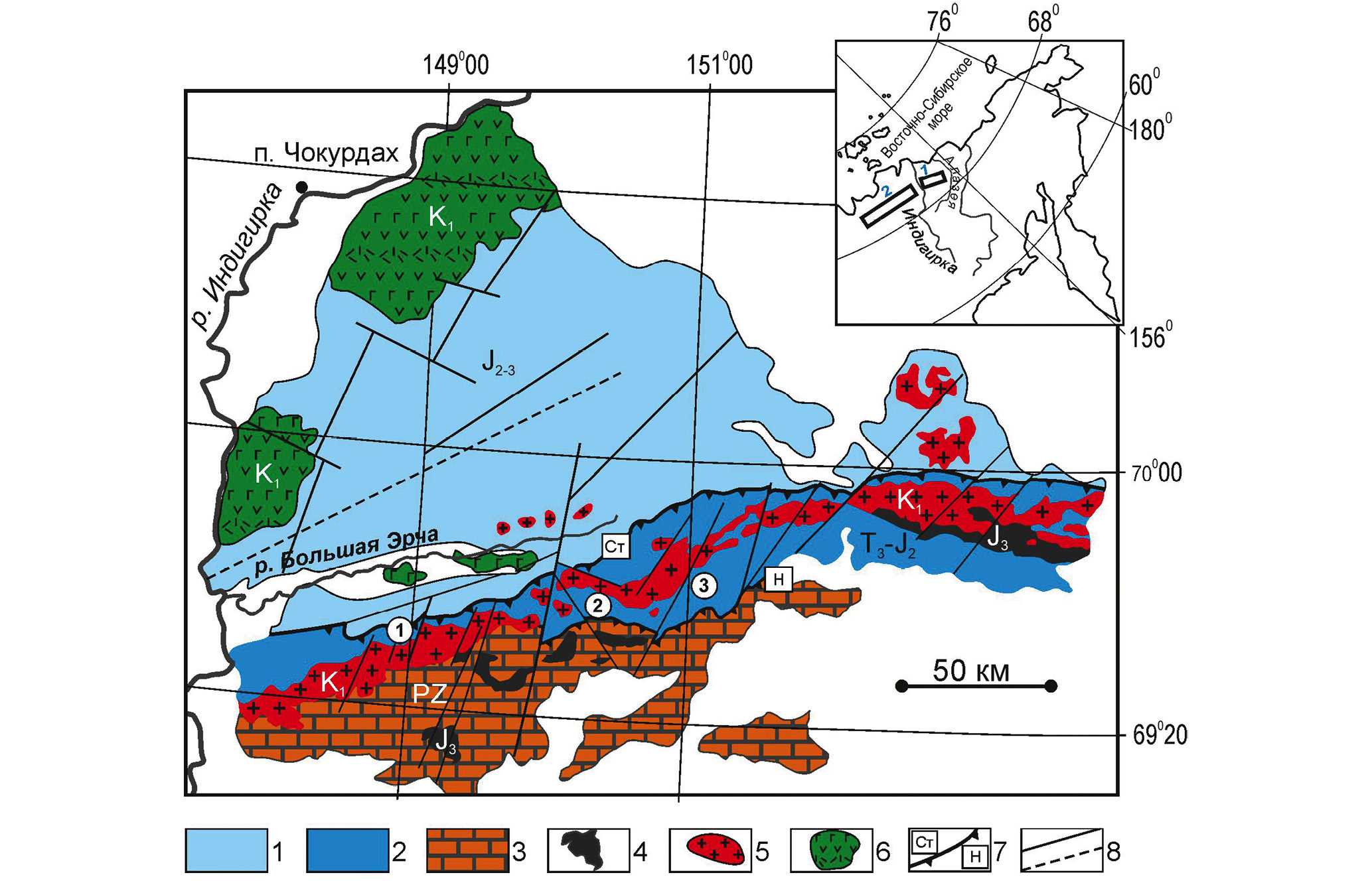 Рис. 1. Схема геологического строения кряжа Улахан-Сис (по [Государственная …, 2000; Тектоника …, 2001]; с упрощениями); на врезке показано географическое расположение: 1 – кряжа Улахан-Сис, 2 – кряжа Полоусный.