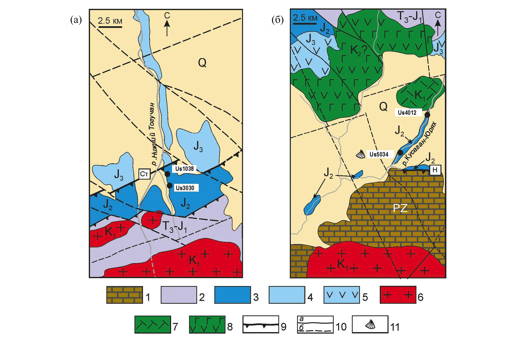 1 – нижне-среднедевонские известняки Улахан-Тасского блока Омулевского террейна; 2, 3 – Нагонджинский террейн: 2 – верхнетриасовые-нижнеюрские карбонатно-терригенные отложения, 3 – среднеюрские вулканогенно-терригенные отложения; 4 – верхнеюрские терригенные отложения Полоусного синклинория, 5 – верхнеюрские вулканиты (андезиты, дациты), 6 – нижнемеловые гранитоиды, 7 – нижнемеловые липариты, 8 – верхнемеловые(?) андезито-базальты; 9 – надвиги, 10 – прочие разрывные нарушения (а – достоверные, б – недостоверные), 11 – местонахождение ретроцерамов.