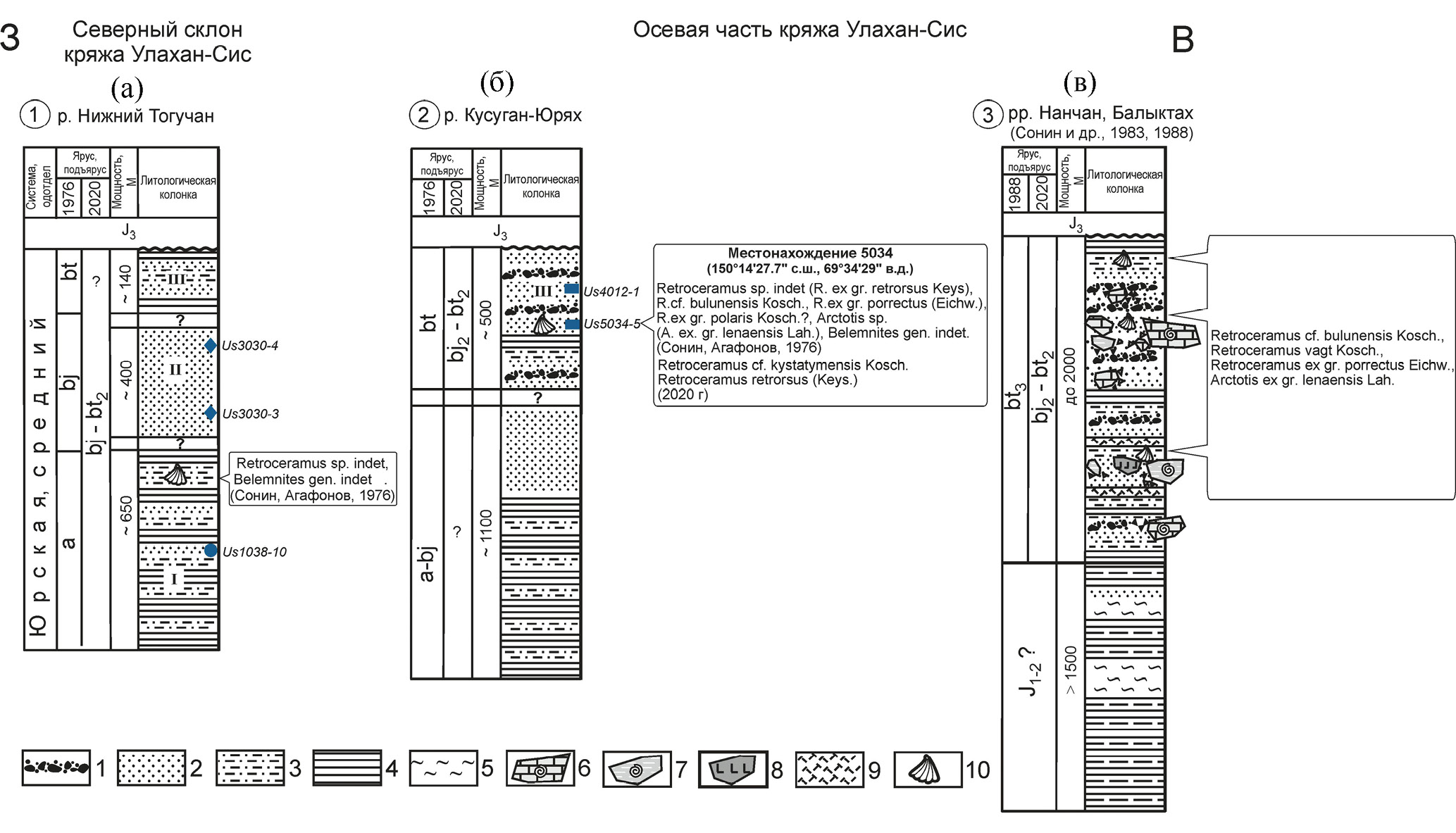 В осевой части кряжа среднеюрские отложения выходят в отдельных тектонических блоках и эрозионных окнах среди поля развития четвертичных образований (см. рис. 2б). Здесь алевролитово-аргиллитовая и песчаниковая толщи, на северном склоне кряжа отнесенные к аалену и байосу, фаунистически не охарактеризованы; их суммарная видимая мощность составляет около 1100 м [Сонин, Агафонов, 19761] (см. рис. 3б). Породы интенсивно ороговикованы вследствие внедрения гранитоидных батолитов в раннемеловую эпоху. Вышележащая преимущественно песчаниковая толща с пластами и линзами гравелитов и конгломератов имеет выходы в русле и по берегам р. Кусаган-Юрях (см. рис. 2б). Видимая мощность верхней толщи в этом районе составляет около 500 м [Сонин, Агафонов, 19761]. На основании находок ископаемых остатков двустворчатых моллюсков Retroceramus sp. indet (R. ex gr. retrorsus Keys), R.cf. bulunensis Коsch., R. ex gr. porrectus (Eichw.), R. ex gr. polaris Kosch.?, Arctotis sp. (A. еx. gr. lenaensis Lah.) и белемнитов Belemnites gen. indet. (определения А. М. Трущелёва и В. Г. Данилова) верхняя толща была отнесена к нерасчлененному бату (см. рис. 3б).