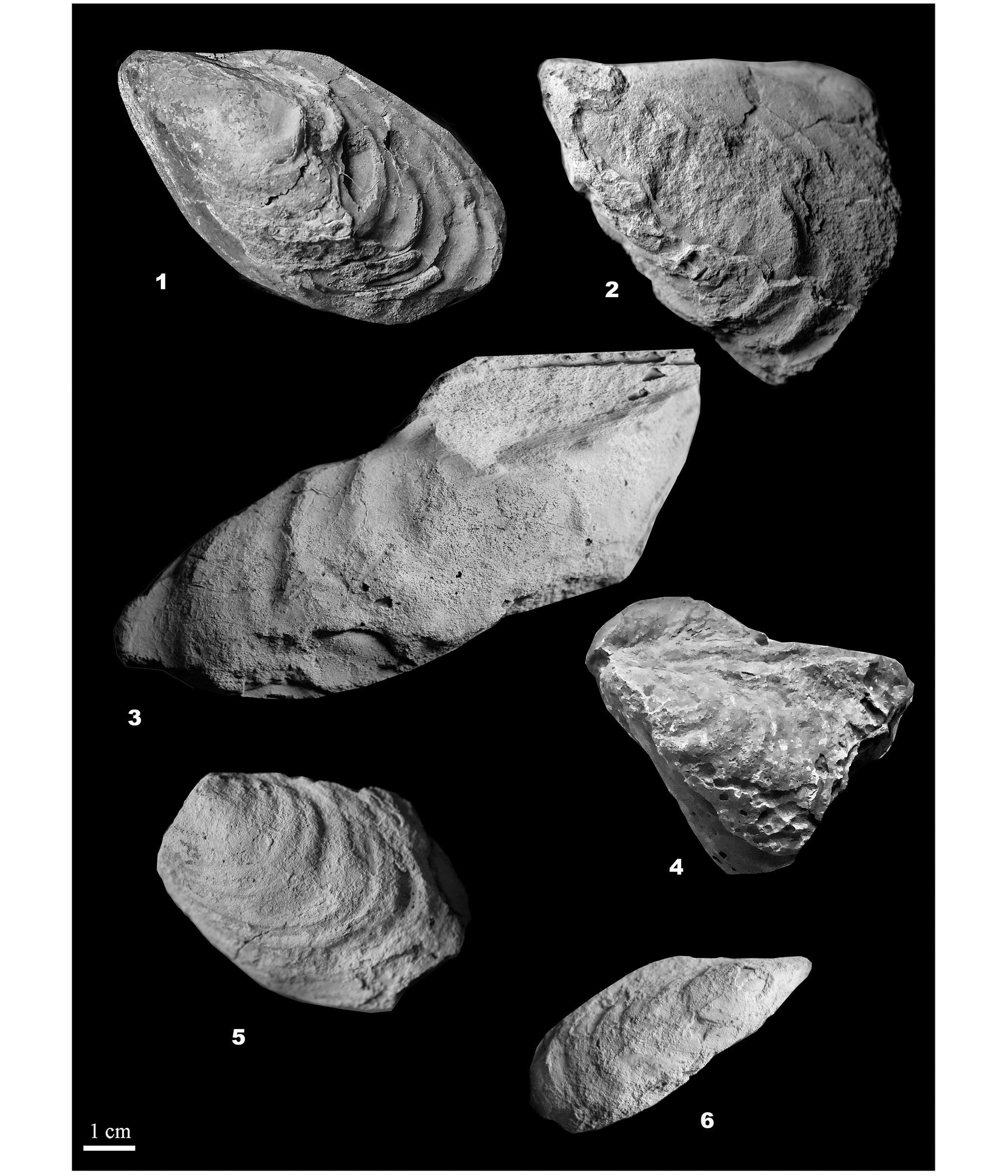 1 – Retroceramus retrorsus (Keys.), верхний байос: экз. № 5034/1, ядро левой створки; 2, 3 – Retroceramus cf. retrorsus (Keys.), возраст тот же: 2 – экз. № 5034/2, примакушечная часть ядра левой створки, 3 – экз. № 5034/3, ядро правой створки с отпечатками связочных ямок и гребней; местонахождение и возраст те же; 4–6 – Retroceramus cf. kystatymensis Kosch., возраст тот же: 4 – экз. № 5034/4, примакушечная часть ядра левой створки и макушка правой створки, выступающая над замочным краем, 5 – экз. № 5034/5, часть ядра левой створки без макушки и примакушечной части, 6 – экз. № 5034/6, ядро правой створки.