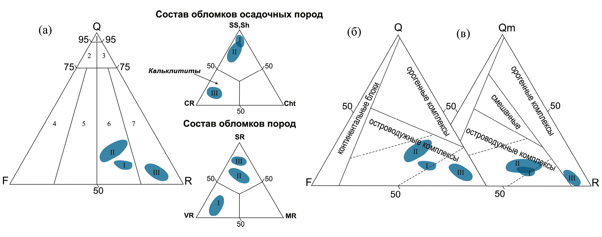 Рис. 6. Состав среднеюрских песчаников на классификационной диаграмме Q–F–R и дочерних диаграммах, по [Folk, 1974] (а), диаграммах Q–F–R и Qm–F–R, по [Dickinson et al., 1983] (б).