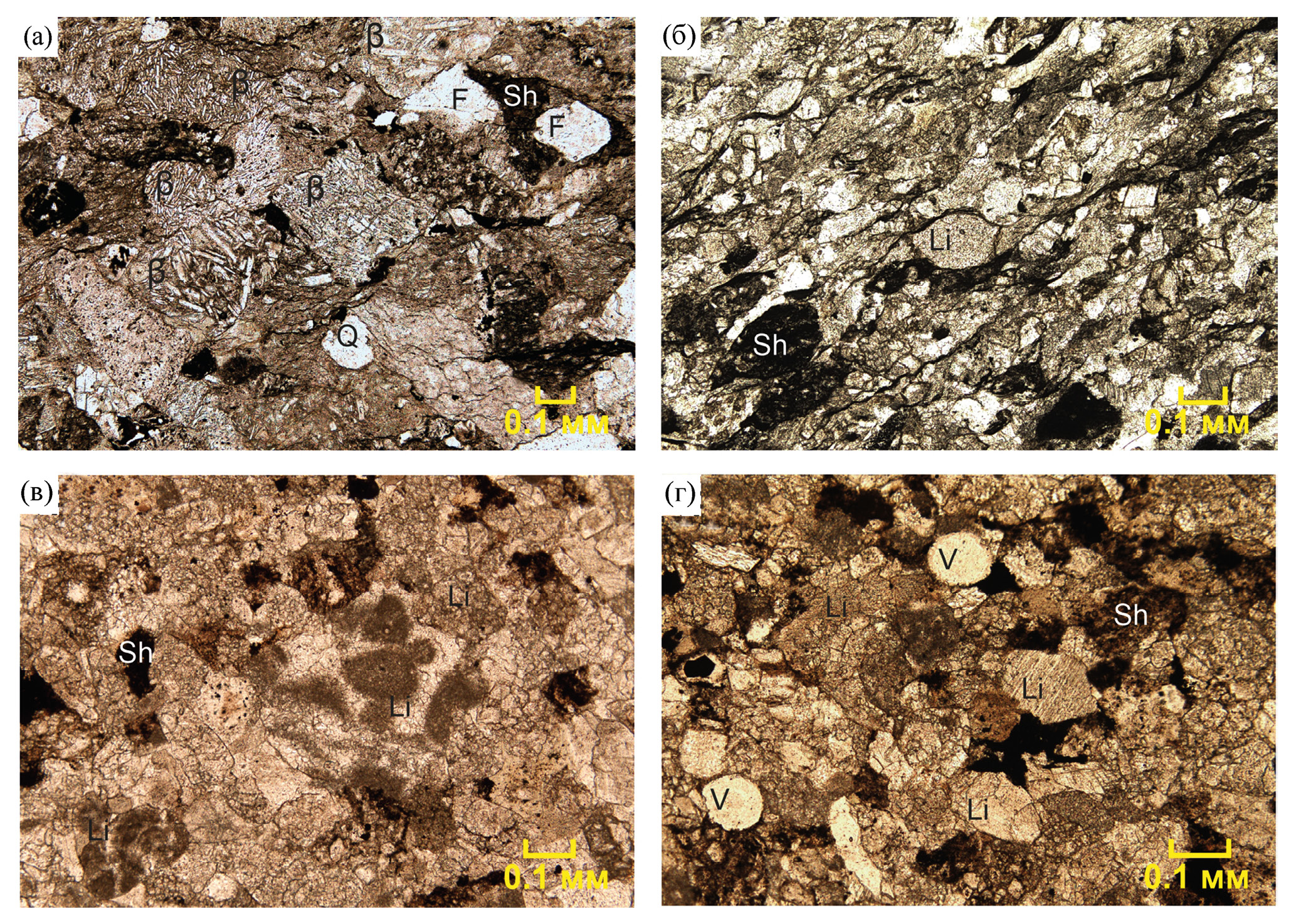 Q – кварц, F – полевые шпаты, β – обломки базальтов, Li – обломки известняков, Sh – обломки глинистых пород, V – сингенетичная витрокластика. Фотографии сделаны в проходящем свете оптического микроскопа, николи параллельны.