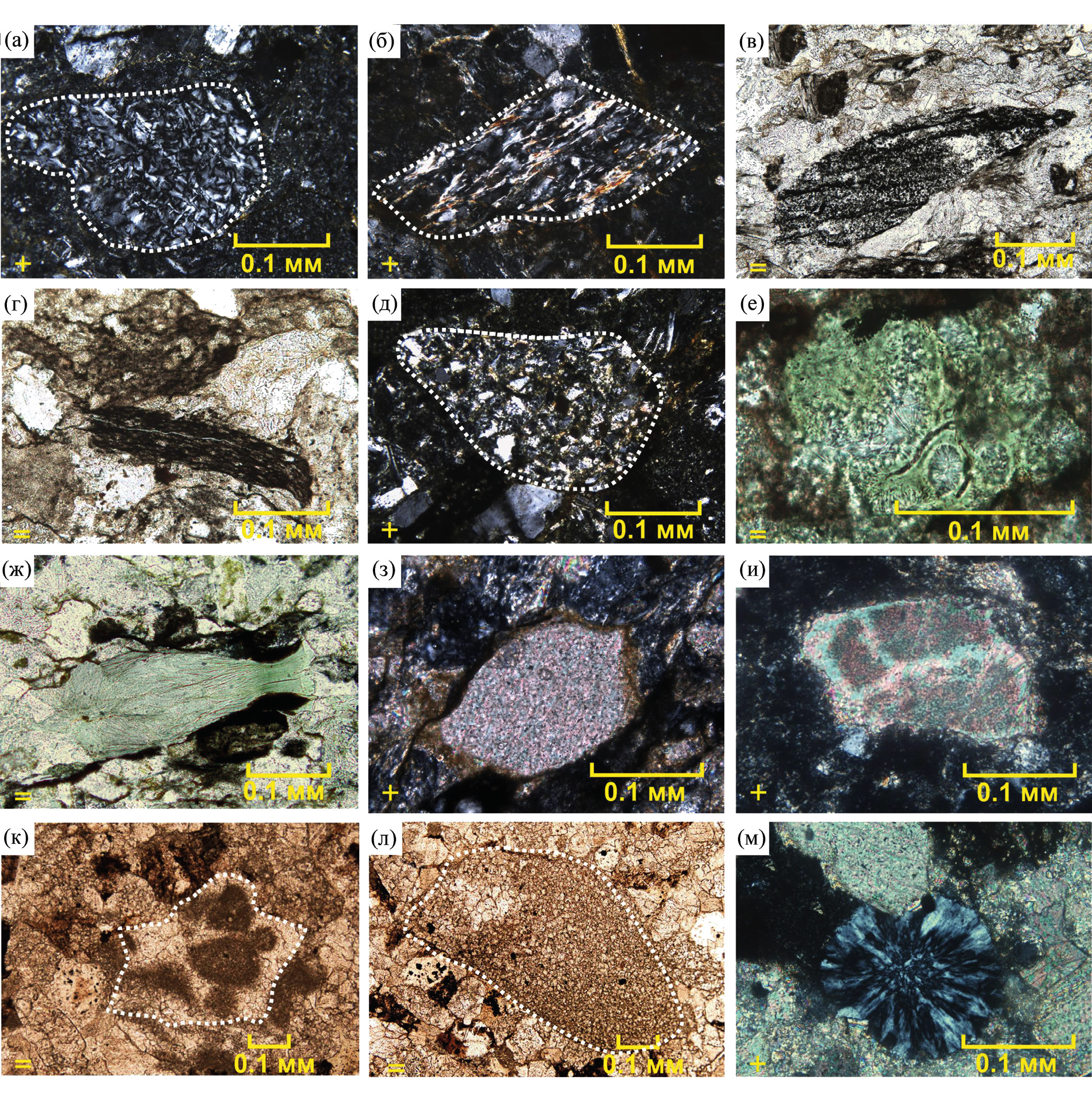 а – фельзит, б – слюдисто-кварцевый сланец, в – углеродисто-кремнистый сланец, г – аргиллит, д – алевролит, е – витрокласт пузырчатый хлоритизированный, ж – витрокласт веретеновидный хлоритизированный, з, и – микритовые известняки, к – водорослевый известняк, л – мелкокристаллический известняк, м – сфероидальный витрокласт с радиально-лучистой структурой. Фотографии сделаны в проходящем свете оптического микроскопа, положение николей указано на фотографиях.