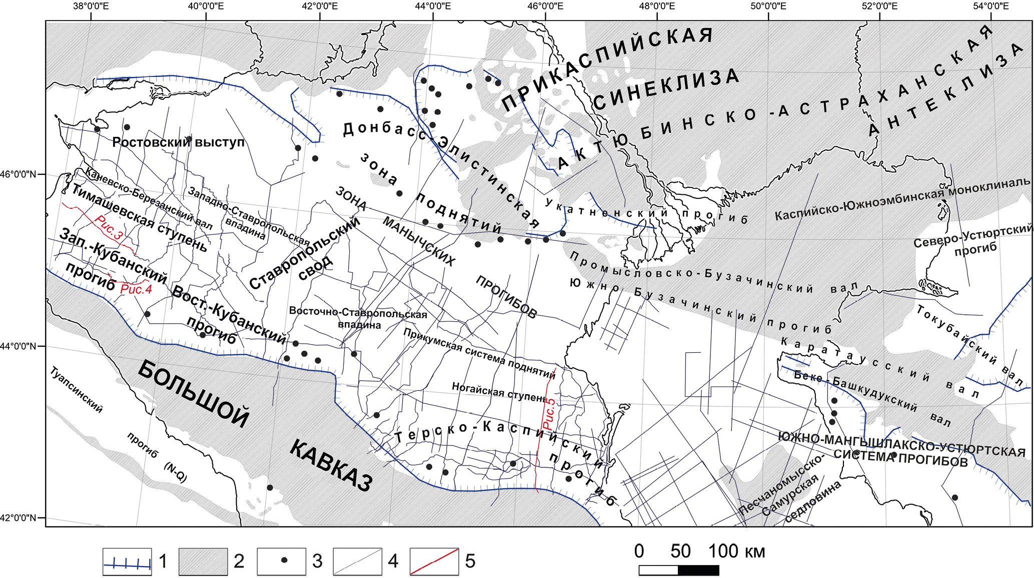 1 ‒ граница современного распространения соленовских отложений (по [Столяров, Ивлева, 1999]). Штрихи направлены строну распространения; 2 ‒ области современного отсутствия майкопских отложений; 3 ‒ опорные разрезы соленовских отложений (по [Воронина, Попов, 1984; Столяров, Ивлева, 1999]); 4 ‒ сейсмические профили МОГТ; 5 ‒ профили, использованные в качестве иллюстраций в статье