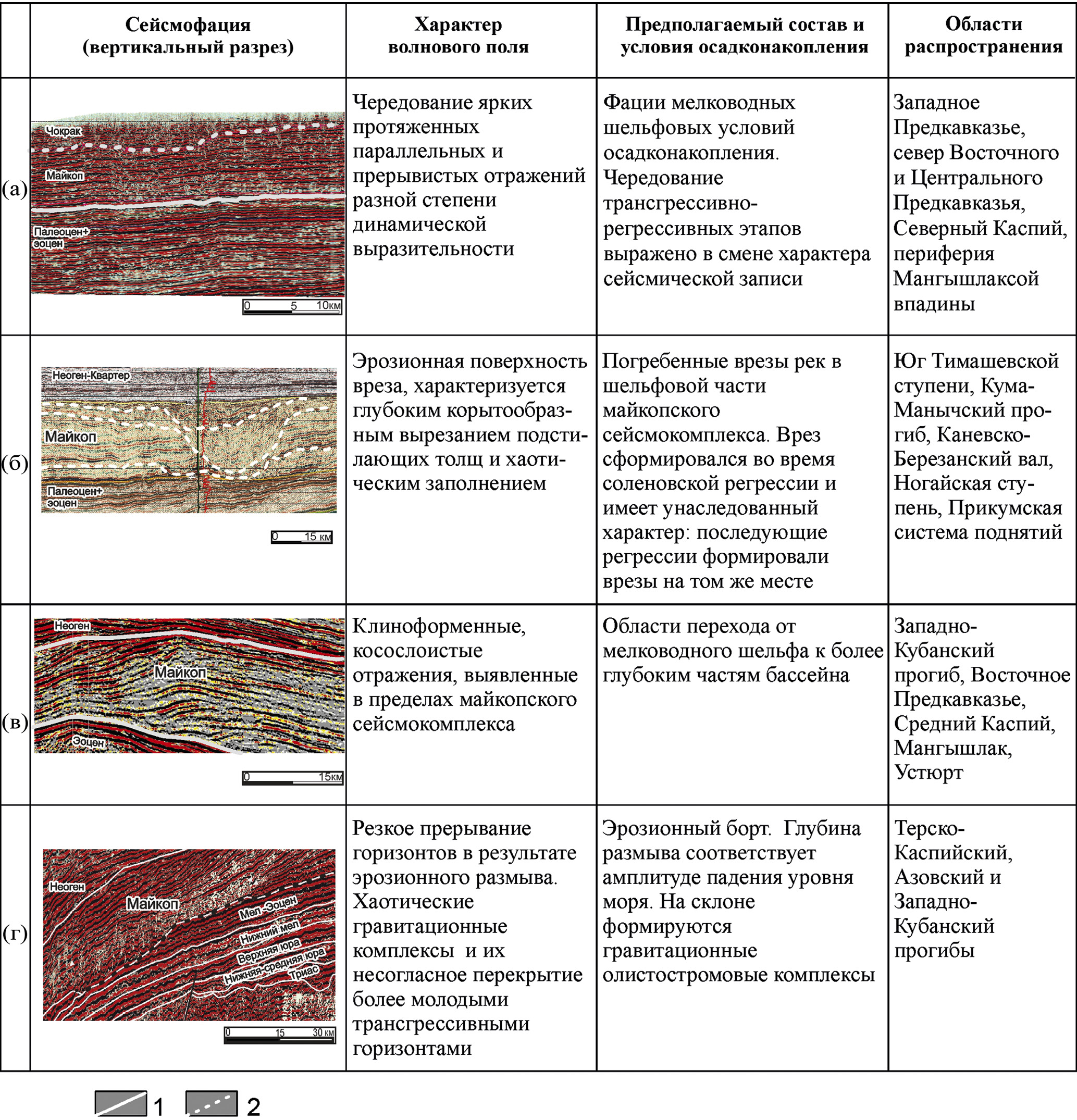 1 ‒ согласные сейсмостратиграфические границы; 2 ‒ эрозионные сейсмостратиграфические границы