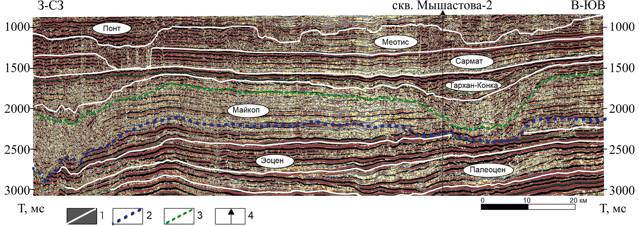 1 ‒ границы сейсмокомплексов; 2, 3 ‒ эрозионные границы внутри майкопского сейсмокомплекса: 2 ‒ соленовского возраста, 3 ‒ позднекалмыцкого (предположительно) возраста; 4 – скважины. Положение профиля см. рис. 1