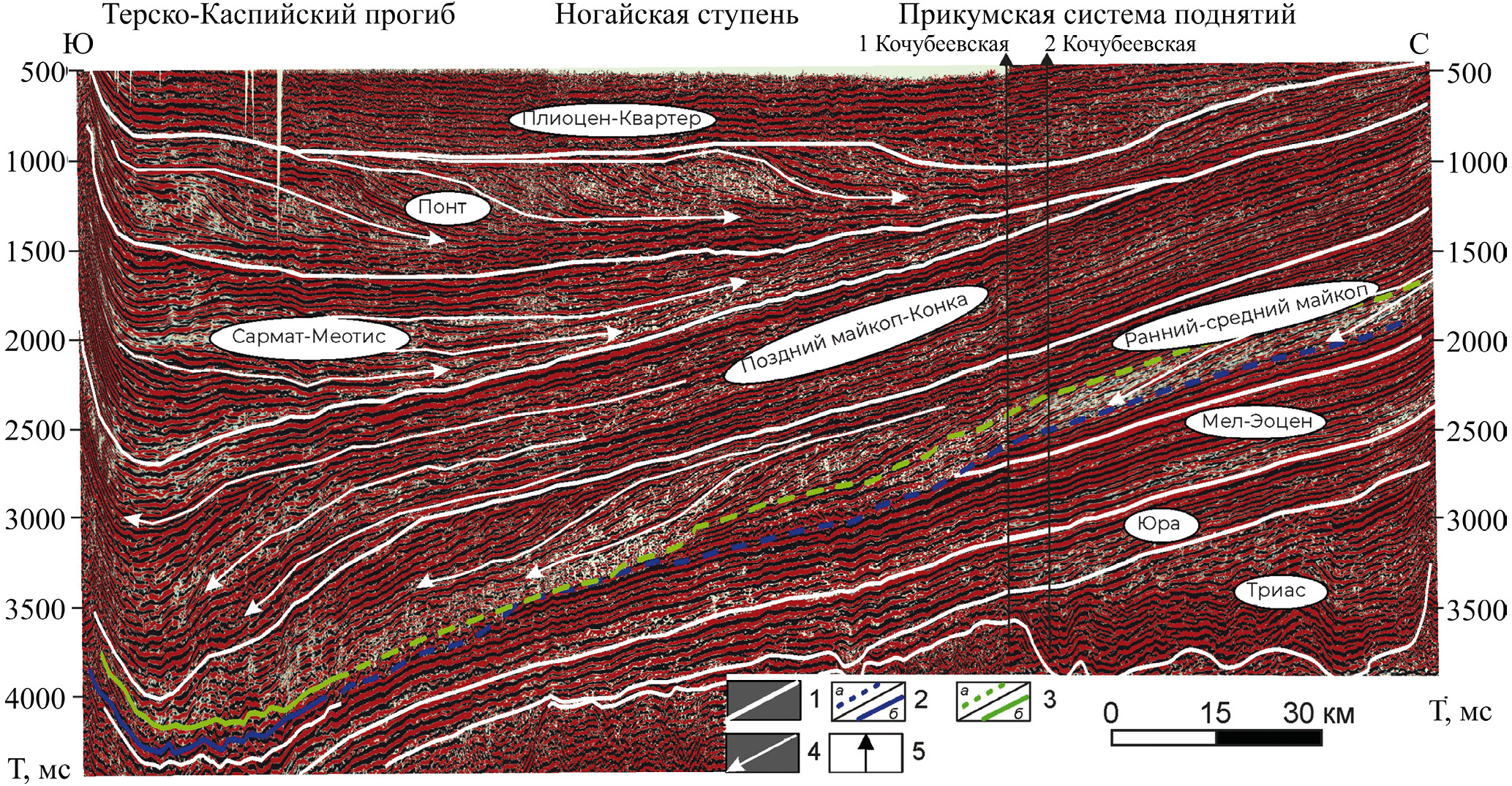 1 – границы сейсмокомплексов; 2, 3 – границы внутри майкопского сейсмокомплекса: 2 – соленовского возраста (а ‒ эрозионные, б ‒ согласные), 3 – позднекалмыцкого (предположительно) (а ‒ эрозионные, б ‒ согласные); 4 – клиноформы; 5 – скважины. Положение профиля см. рис. 1
