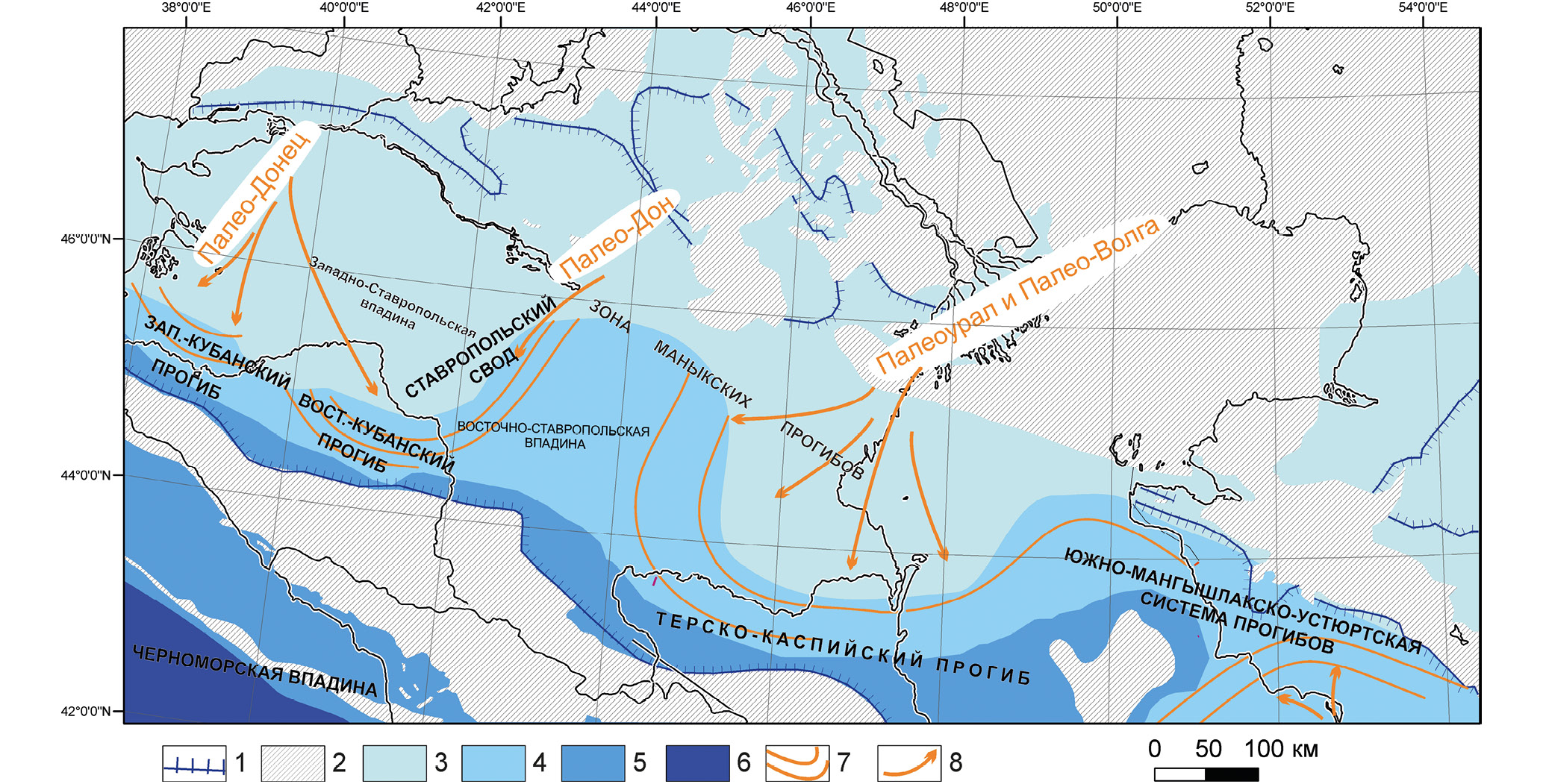 1 – граница современного распространения соленовских отложений (по [Столяров, Ивлева, 1999]). Штрихи направлены в сторону распространения; 2 – области современного отсутствия майкопских отложений; 3 – области компенсированной седиментации (мелководный шельф); 4 – области лавинной седиментации (погруженный шельф); 5 – области некомпенсированной седиментации (впадины и прогибы); 6 – глубоководная впадина; 7 – клиноформы; 8 – направление переноса терригенного материала