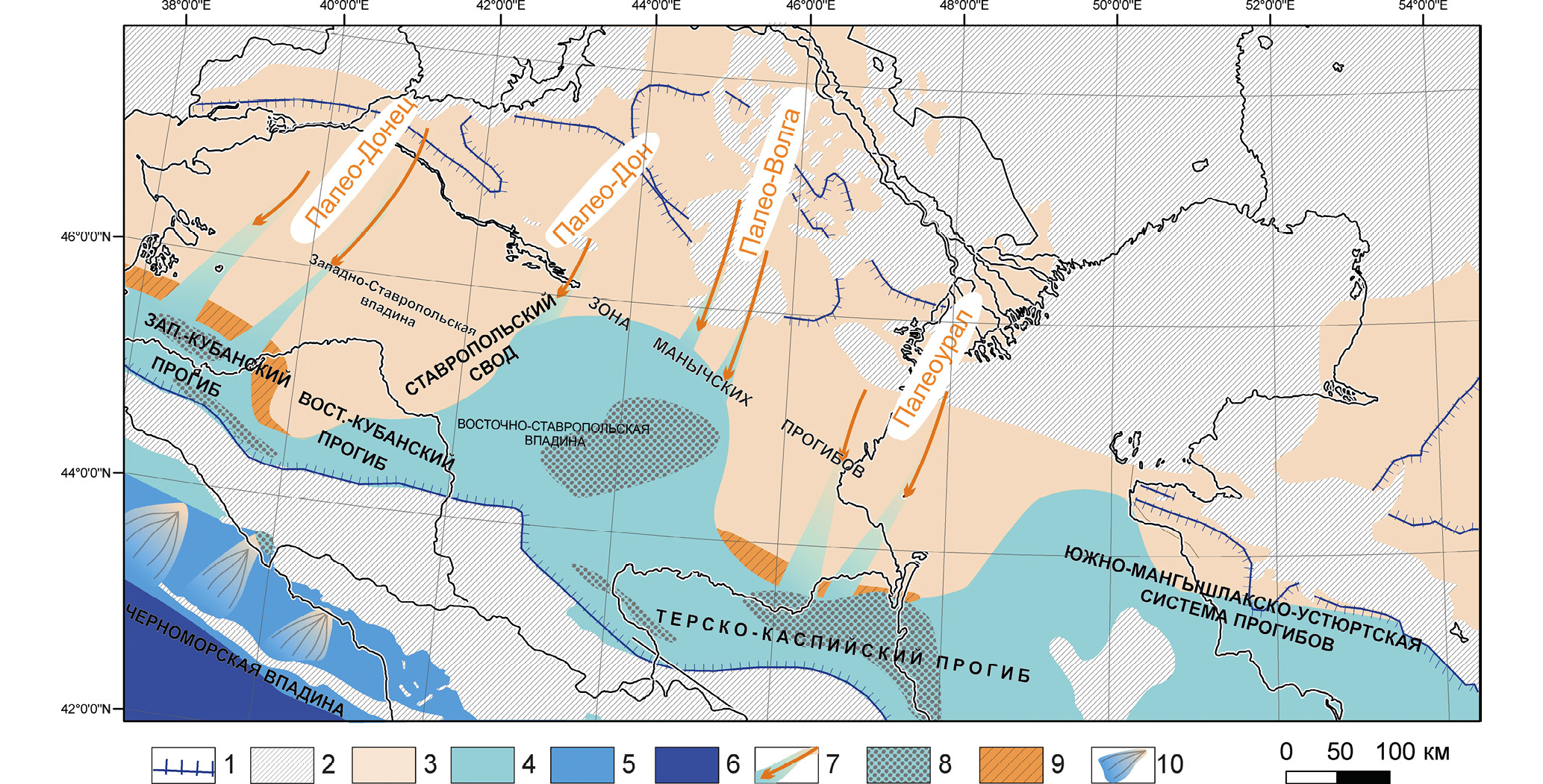 1 – граница современного распространения соленовских отложений (по [Столяров, Ивлева, 1999]). Штрихи направлены в сторону распространения; 2 – области современного отсутствия майкопских отложений; 3 – области эрозии; 4 – области компенсированной (мелководный шельф) и лавинной (погруженный шельф) седиментации; 5 – области некомпенсированной седиментации (впадины и прогибы); 6 – глубоководная впадина; 7 – врезанные долины палеорек и направление переноса в них терригенного материала; 8 – области развития гравитационных фаций; 9 – абразионные уступы; 10 – области развития глубоководных конусов выноса