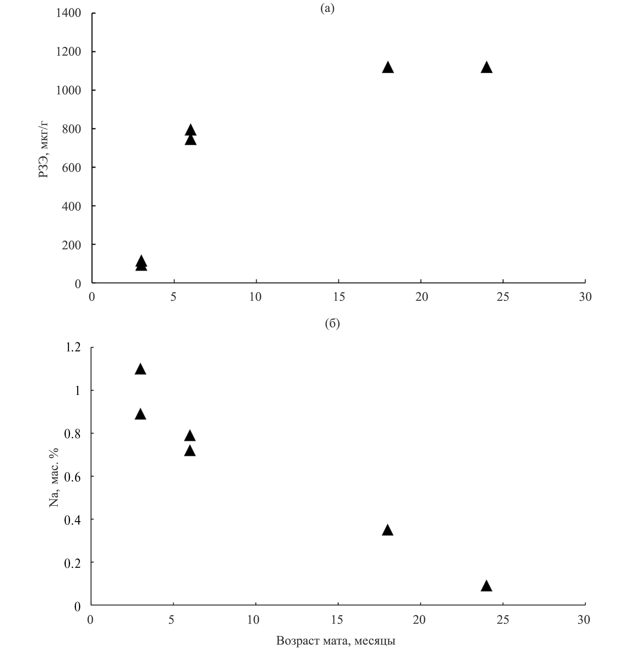 Содержание железа в пробах до обработки HCl составляло от 16.7 (локация Скачки) до 37.9 мас. % (локация р. Сестра Заводская), марганца – от 300 до 1300 мкг/г. Выделенные из бактериальных матов оксигидроксиды железа показывают значительное обогащение РЗЭ – в несколько раз превосходящее концентрации этих элементов в стандартных постархейских глинистых сланцах (NASC, PAAS) по [Gromet et al., 1984; Taylor, McLennan, 1985] (табл. 1). Наблюдается зависимость содержания РЗЭ от возраста бактериального мата или от расхода воды в водотоке. В локации оз. Орлинское в оксигидроксидах железа из бактериального мата в обстановке c расходом воды 0.4 л/с (образец Orl-A) суммарное содержание РЗЭ (950 мкг/г) более чем в три раза выше по сравнению с образцом Orl-S из зоны с расходом воды 0.15 л/с (310 мкг/г), расстояние между этими местами пробоотбора составляет не более 50 см. По мере увеличения возраста мата от 3 до 18 месяцев (локация Скачки) содержание РЗЭ в оксигидроксидах железа увеличивается более чем на порядок: от ~100 до ~1120 мкг/г. В бактериальных оксигидроксидах железа из матов возрастом не менее двух лет (локация Сестра Заводская) суммарное содержание РЗЭ составляет 1121 мкг/г. Концентрация примеси натрия в бактериальных оксигидроксидах Fe уменьшается от 1.1 мас. % в матах возрастом 3 месяца до 0.09 мас. % в мате возрастом 24 месяца, зависимость содержания РЗЭ и Na от возраста матов показана на рис. 2.