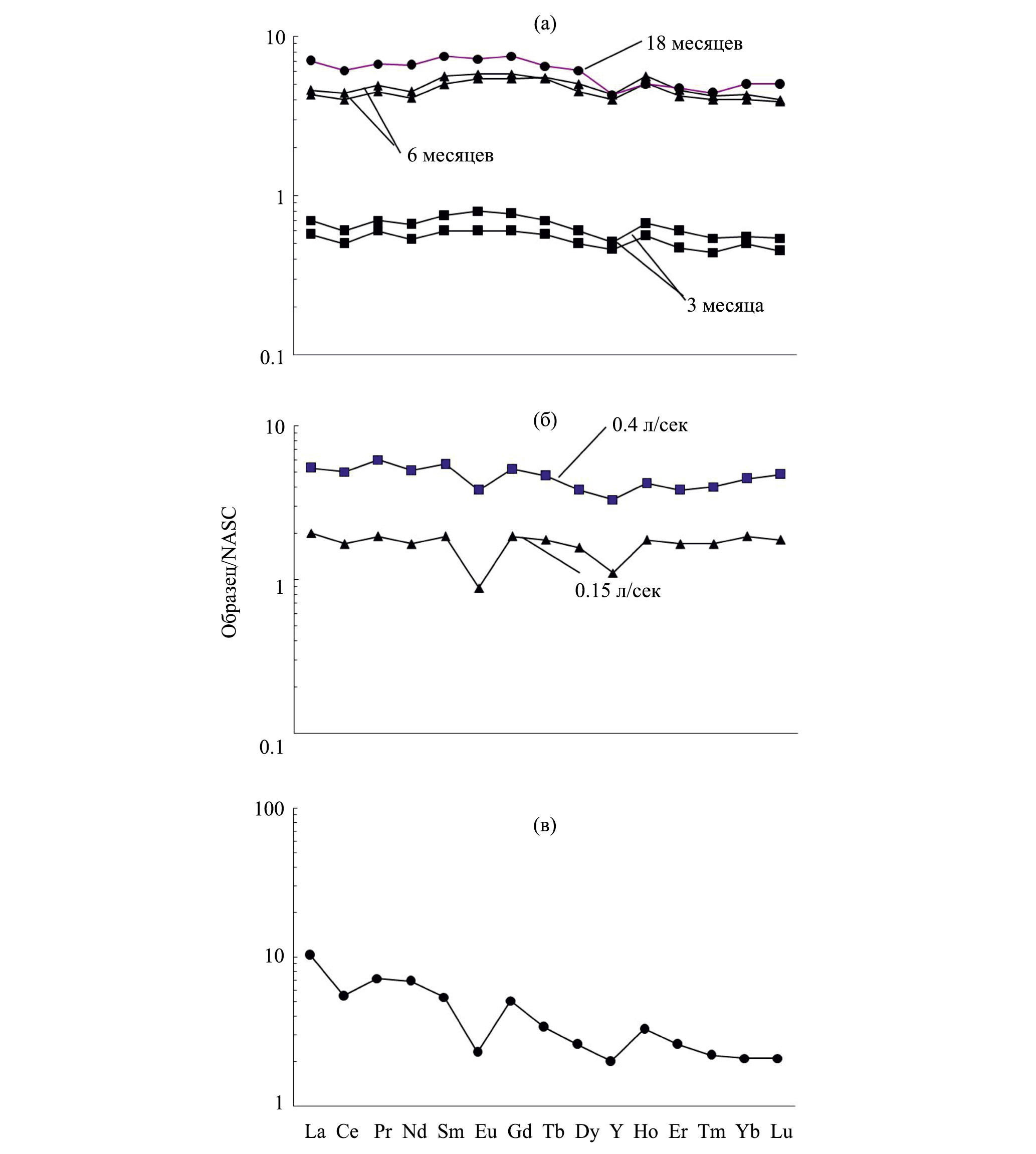 Спектры распределения РЗЭ в изученных образцах бактериальных оксигидроксидах железа (рис. 3) демонстрируют незначительное обогащение легкими РЗЭ относительно тяжелых РЗЭ: величина отношения (La/Yb)N составляет от 1.0 до 1.3 и не изменяется по мере увеличения возраста мата. Также не меняются во времени индикаторные характеристики спектра РЗЭ (Ce- и Eu-аномалии, обеднение Y относительно Dy и Ho, отношение легкие РЗЭ/средние РЗЭ/тяжелые РЗЭ). В оксигидроксидах железа из локации р. Сестра Заводская величина отношения La/YbN составляет около 5.0 и имеет место выраженная отрицательная Eu-аномалия.