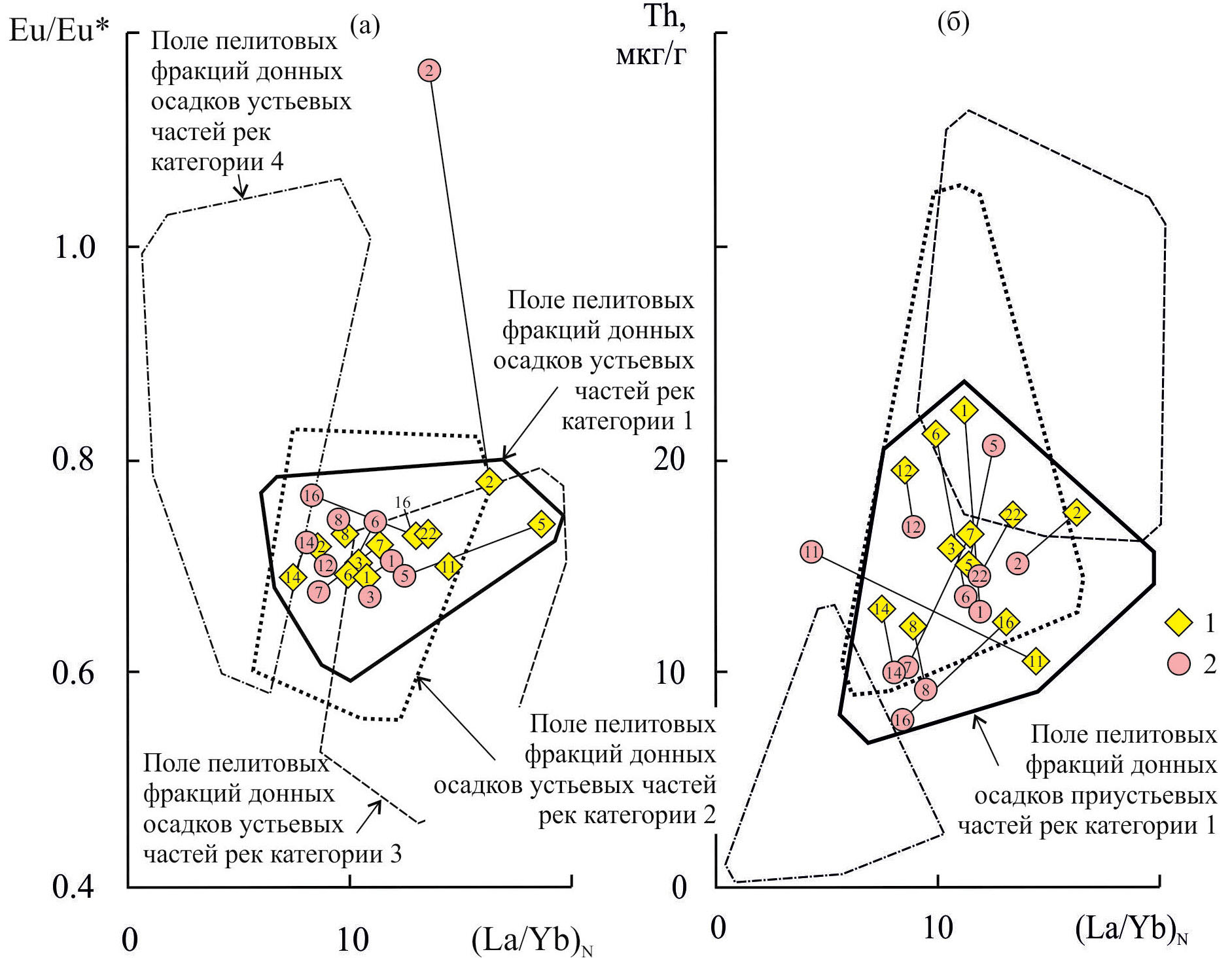 Сравнение положения на указанных и ряде других парных диаграмм положения точек состава пелитовых (<2 мкм) фракций донных осадков приустьевых участков рек (данные из работы [Bayon et al., 2015]) и точек состава взвешенных наносов тех же рек (Амазонка, Конго, Миссисипи, Нигер, Янцзы, Маккензи, Волга, Дунай, Меконг, Амударья, Северная Двина и Луара, все относятся к категории 1), аналитические данные для которых суммированы в монографии [Савенко, 2006], позволяет увидеть следующее. На диаграмме (La/Yb)N–Eu/Eu* (рис. 1а) точки состава пелитовой фракции донных осадков приустьевых частей крупных современных рек, аналитические данные для которых получены по специально обработанным пробам [Bayon et al., 2015], образуют поле, описываемое значениями 7 < (La/Yb)N < 20 и 0.60 < Eu/Eu* < 0.80. В это поле попадают практически все (за исключением точки наносов Конго) фигуративные точки взвесей перечисленных выше рек, данные по которым систематизированы в работе [Савенко, 2006]. Близкую ситуацию можно наблюдать и на диаграмме (La/Yb)N–Th (см. рис. 1б). Здесь фигуративные точки пелитовых фракций донных осадков приустьевых частей рек категории 1 образуют поле, описываемое значениями 7 < (La/Yb)N < 20 и 6 < Th < 23. В этом же поле локализованы и практически все точки состава взвеси перечисленных рек, нанесенные на основе данных о содержании лантаноидов и Th, приведенных в монографии [Савенко, 2006]. Единственное исключение – взвесь Дуная. Очевидно, что фигуративные точки пелитовой фракции донных осадков приустьевых частей современных рек категории 1 и их взвеси локализованы на диаграммах (La/Yb)N–Eu/Eu* и (La/Yb)N–Th в одном и том же поле состава тонкой алюмосиликокластики рек категории 1, хотя значения (La/Yb)N и Eu/Eu*, как и содержания Th, для одной и той же реки заметно варьируют. Из сказанного следует, что использование данных о химическом составе валовых, специальным образом не обработанных, проб речной взвеси, позволяет сделать достаточно корректные выводы относительно категорий рек, транспортирующих сейчас, и, вероятно, транспортировавших в геологическом прошлом, тонкую алюмосиликокластику в конечные водоемы стока [Маслов, 2024].