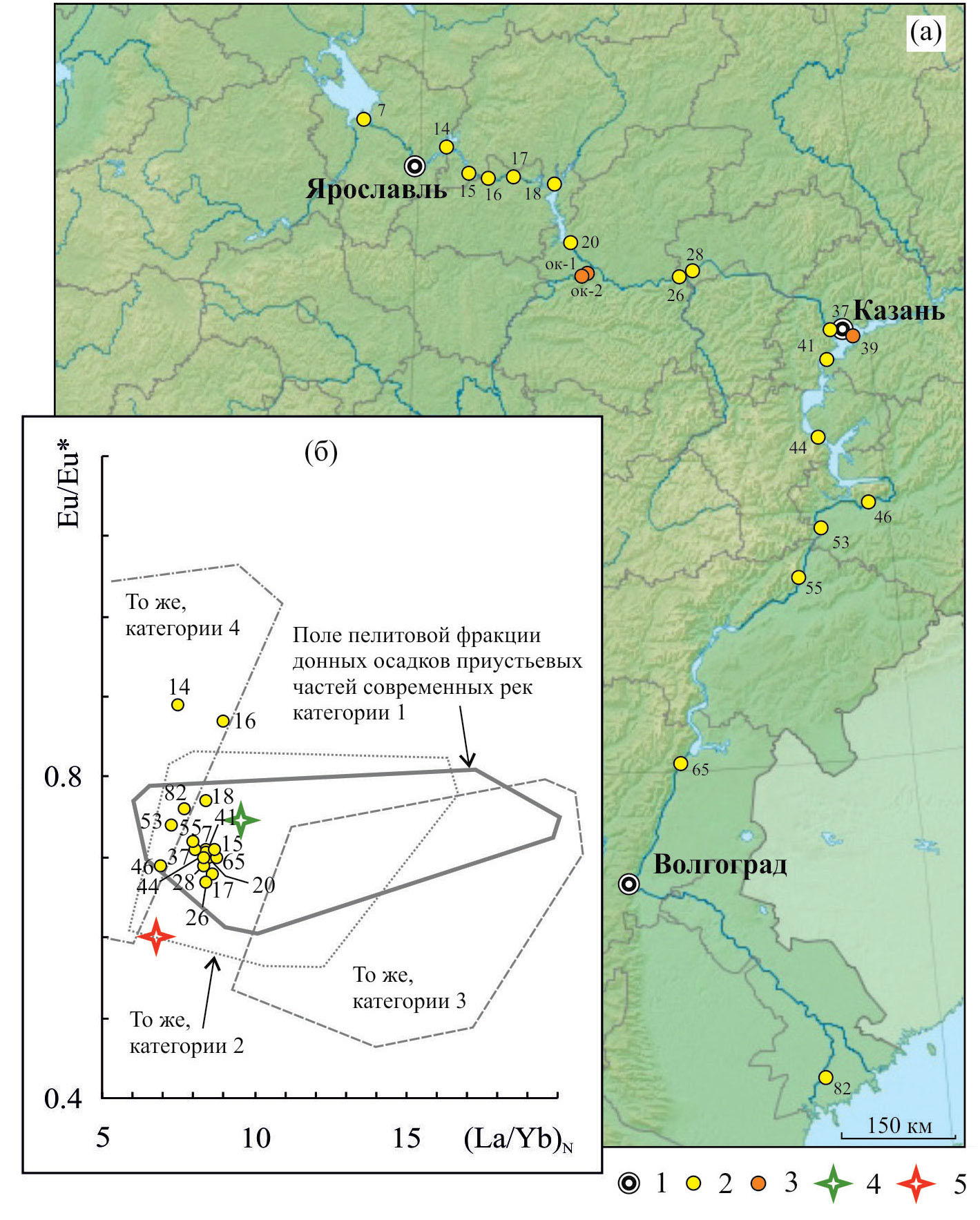 В работе [Bayon et al., 2015], как и во всех других, подобного рода публикациях, Волга отнесена к категории крупных рек (реки категории 1). На диаграмме (La/Yb)N–Eu/Eu* с полями состава пелитовых фракций донных осадков приустьевых частей различных категорий современных рек подавляющее количество фигуративных точек проб серых илов, отобранных от дельты Волги до Рыбинского водохранилища (рис. 2а) расположено в области перекрытия полей пелитовых фракций донных осадков приустьевых частей рек категорий 1 и 2 (см. рис. 2б).