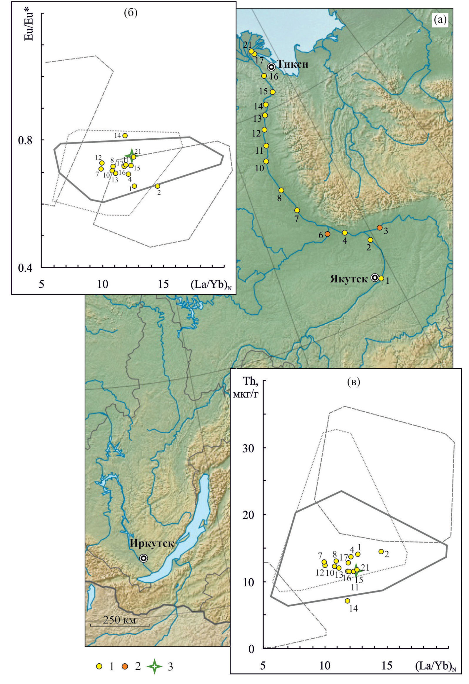 Содержание Th в ленской взвеси и взвеси ее притоков хотя и заметно варьирует, но в принципе, как мы уже видели выше (см. рис. 4), не выходит за диапазон величин, характерных для пелитовой фракции донных осадков приустьевых частей современных крупных рек (см. рис. 5г). Некоторое исключение и здесь – взвесь, отобранная на ст. 14. Исходя из свойственных ей довольно низкого значения Eu/Eu* и низкого содержания Th, можно предполагать, что в ее составе присутствует определенная доля продуктов размыва магматических пород основного состава. Однако величина (La/Yb)N для данной пробы такая же, как и в пробах, не обладающих спецификой по значениям Eu/Eu* и содержанию Th.