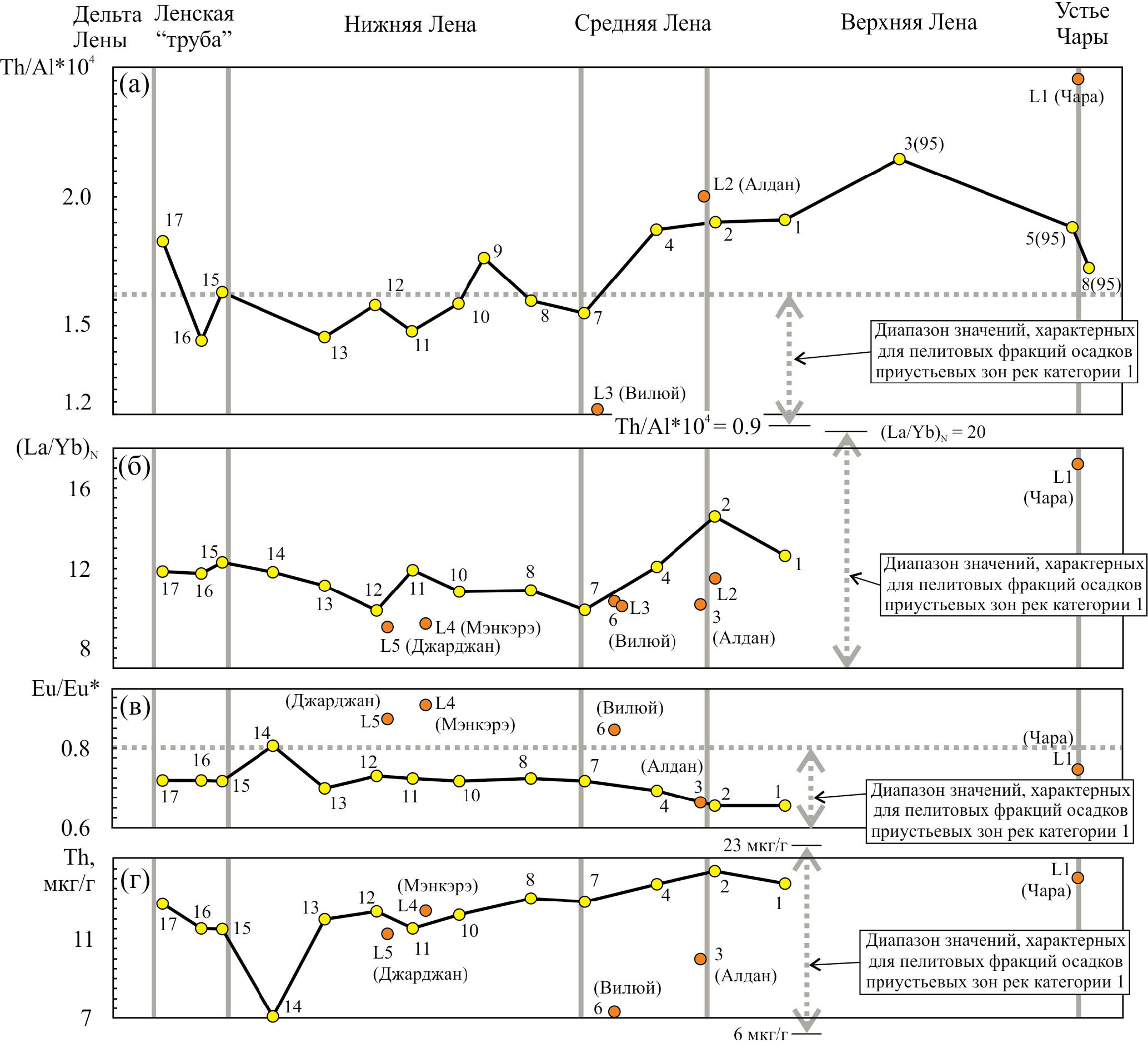 Следовательно, от дельты Лены и до, как минимум, бассейна Чары, т.е. на протяжении почти 2400 км (это ~55% от общей длины реки), параметры (La/Yb)N и Eu/Eu*, а также содержание Th в ленской взвеси остаются в рамках значений, свойственных пелитовым фракциям донных осадков приустьевых частей современных рек категории 1. Наиболее важными факторами этого, несомненно, являются громадная площадь водосбора и преобладание в его пределах, по крайней мере, в среднем и нижнем течении, осадочных образований. В верхнем течении Лены, где роль осадочных пород на водосборах заметно меньше, ситуация может быть иной, но, как показывает пример Чары, по всей видимости, и это не является критичным.