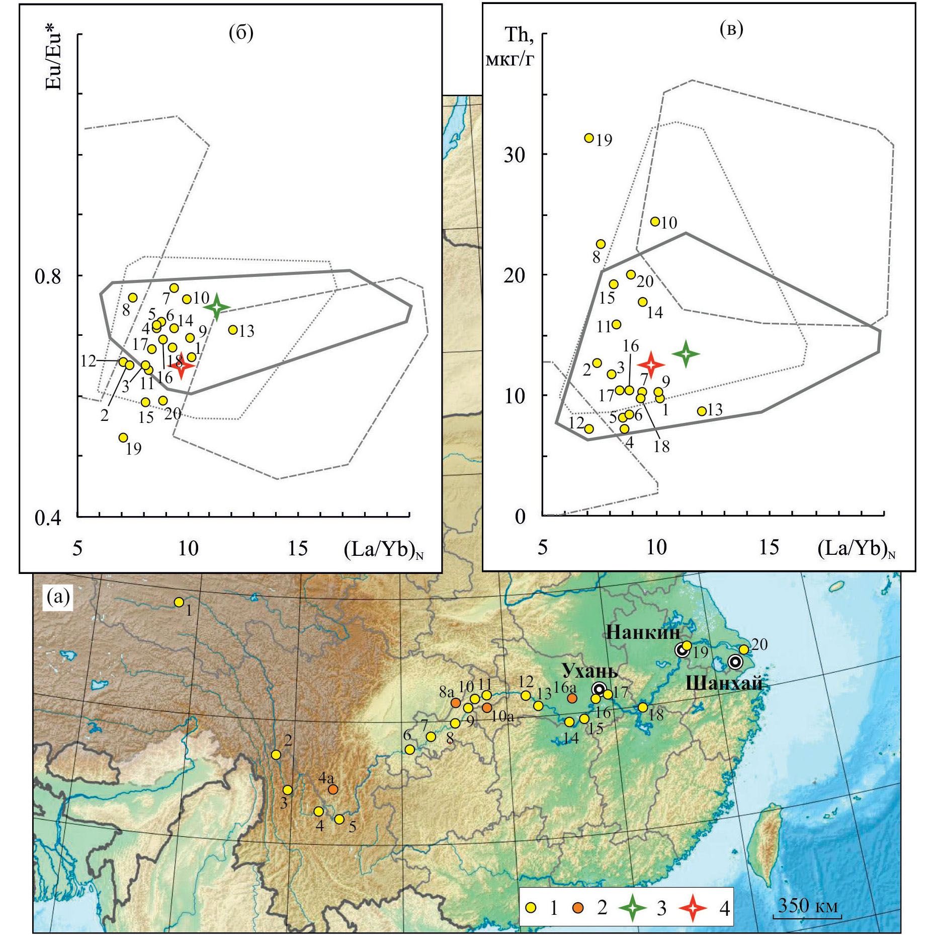 Для исследования геохимических характеристик донных осадков Янцзы использована аналитическая информация (метод ICP-MS) по алевритово-пелитовым (<63 мкм) их фракциям [He et al., 2014] и составе таких же фракций ряда крупных притоков (см. табл. 1). Предварительно из проб были удалены карбонаты и органика. По представлениям названных авторов, основанным, в том числе и на данных о Sm-Nd систематике, большинство донных осадков Янцзы формируется из продуктов эрозии пород одноименного кратона, террейна Сонгпан-Гарзэ (Восточный Тибет), а также провинции Юньнань. Данные по геохимии взвеси Янцзы на всем ее протяжении нам, к сожалению, не известны.