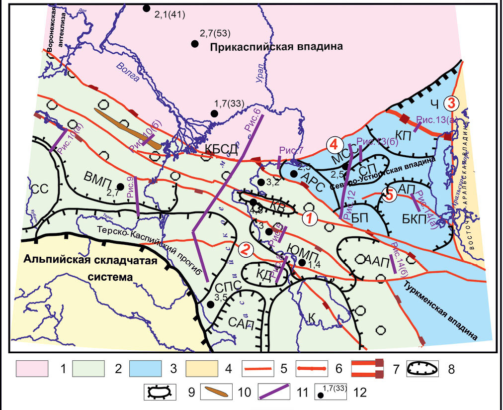 1 – Восточно-Европейская (Прикаспийская часть), 2 – Скифская, 3 – Западно-Туранская, 4 – Восточно-Туранская; 5 – трансконтинентальные сдвиги (цифры в кружках: 1 – Донбасс-Зеравшанский, 2 – Аксу-Киндерлинский, 3 – Урало-Герирудский, 4 – Южно-Эмбинский, 5 – Актумсукский); 6 – разломы сдвиго-надвигового характера; 7 – Донбасс-Туаркырский палеозойский рифт; 8 – прогибы: ВМП – Восточно-Манычский, ЮМП – Южно-Мангышлакский, САП – Северо-Апшеронско-Келькорский прогиб, КД – Казахская депрессия, ААП – Ассакеаудинский прогиб, Ч – Челкарский прогиб, КП – Косбулакский прогиб, БКП – Барсакельмесский прогиб, СП – Самский прогиб; 9 – поднятия: СС – Ставропольский свод, СПС – Самурско-Песчаномысская седловина, КБСД – Каракульско-Бузачинская система дислокаций, К – Карабогазский свод, АП – Актумсукское поднятие, БП – Байчагырское поднятие, АРС – Арыстановская ступень, МСС – Мынсуалмасская ступень, КВ – Каратауский вал; 10 – Промыслово-Цубукский грабен; 11 – рисунки (разрезы), приведенные в тексте; 12 – максимальные мощности триасовых отложений (км), в скобках – скорости прогибания, м/млн л.