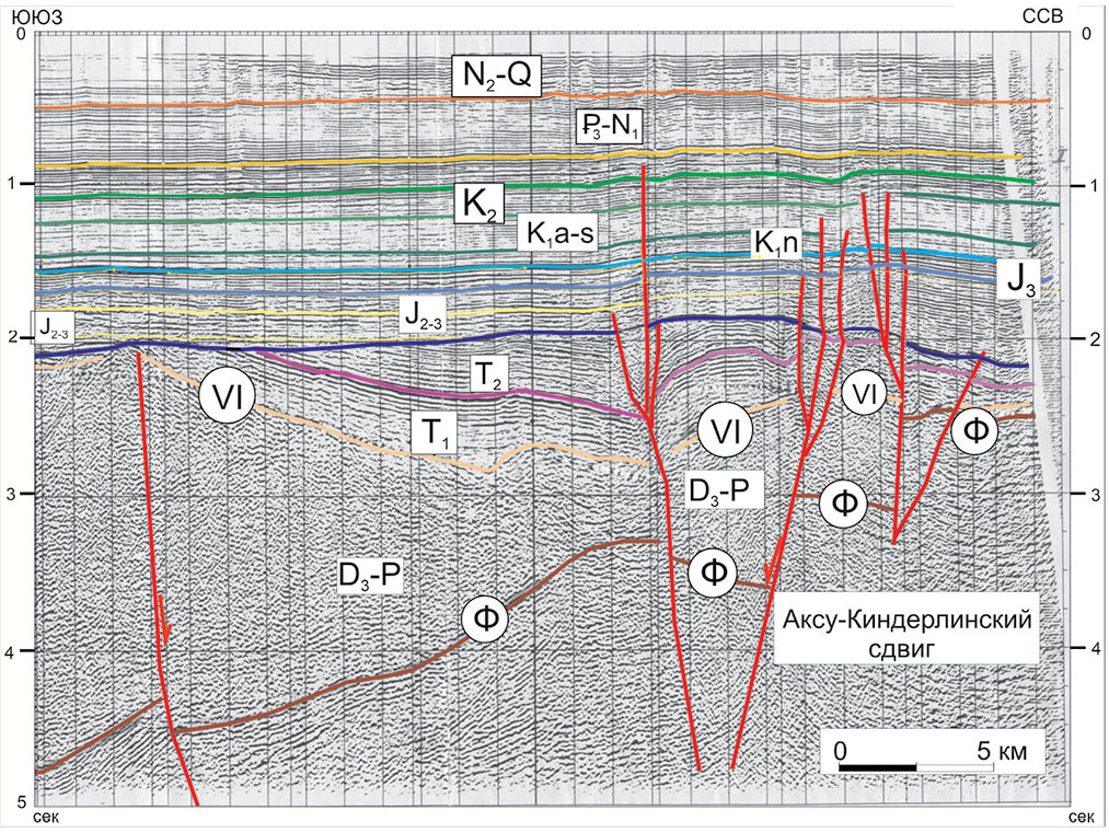 Рис. 8. Сейсмостратиграфический разрез в прибрежной прикарабогазской части Среднего Каспия пересекает Аксу-Киндерлинский сдвиг [Леонов и др., 2010].