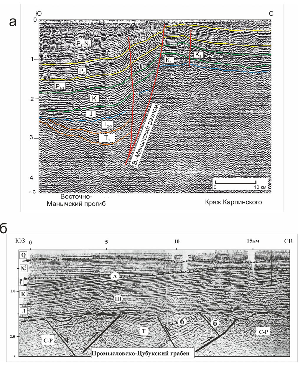 Рис. 10. Временные сейсмические разрезы (фрагменты) через северо-западную часть Восточно-Манычского прогиба (а) и Промысловско-Цубукский грабен (б) [Волож и др., 1999].