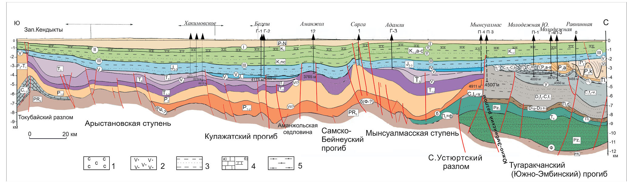 Положение профиля показано на рис. 2. 1 – эвапориты, 2 – вулканогенно-осадочные породы, 3 – терригенные породы, 4 – карбонатные породы (а – палеозойские, б ‒ меловые), 5 – терригенно-карбонатные породы.