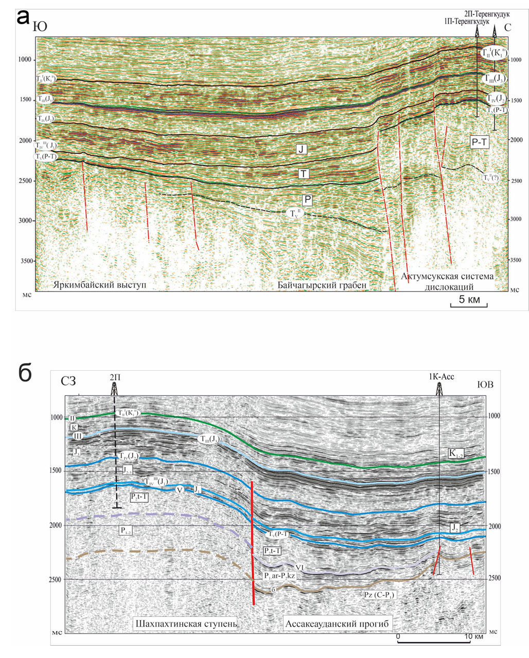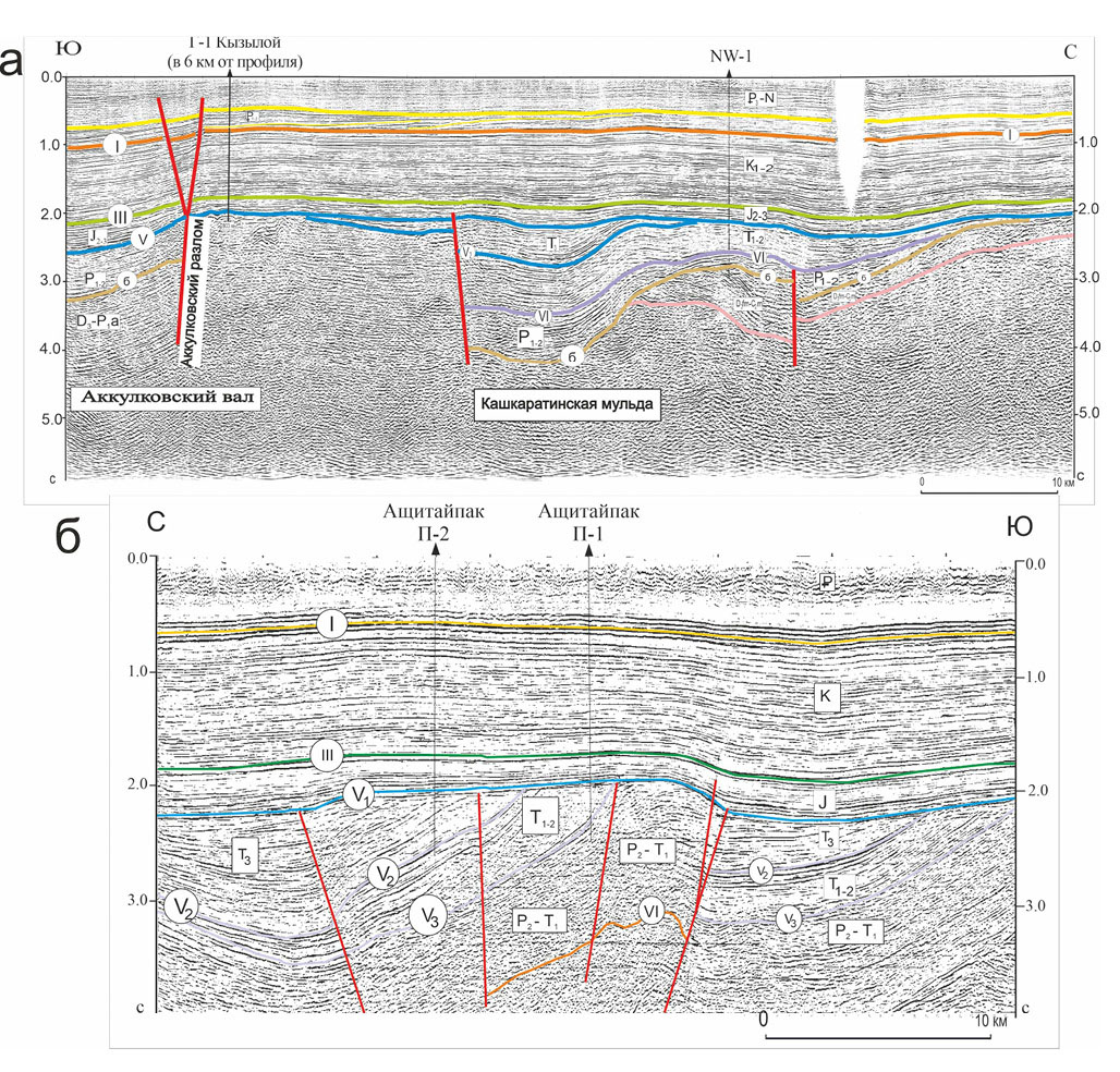 Рис. 13. Сейсмические разрезы – Кашкаратинский (а) и Ащитайпакский (б).