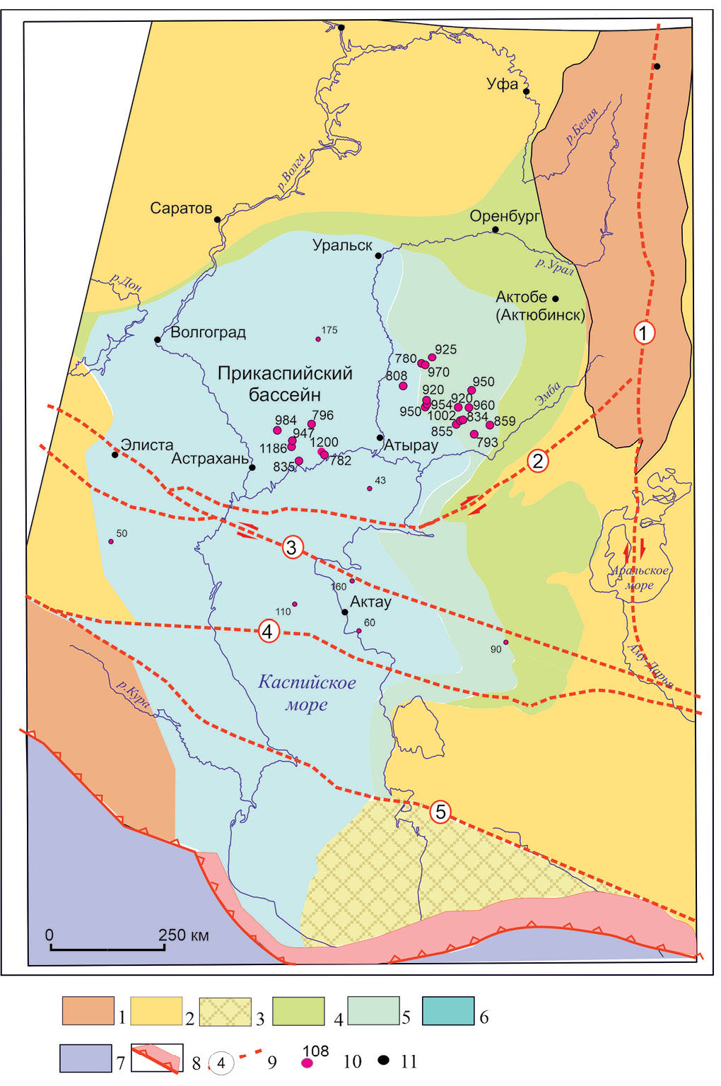 Примечание. UFB – Uralian Foreland Basin – Уральский передовой прогиб, SUM – South Uralian Massif – Южно-Уральский массив, NCB – North Caspian Basin – Северо-Каспийский бассейн, AKM – Aral-Kizylkum Massif – Арал-Кызылкумский свод, KpS – Karpinski Swell – кряж Карпинского, EMG – East Manych Graben – Восточно-Манычский грабен, PkH – Prikumsk High – Прикумское поднятие, MkG – Makhachkala Graben ‒Махачкалинский грабен, BIG – Belalabinskaya Group – Белалабинская группа, Dib – бассейн Дизи, DzM – Dzirula Massif – Дзирульский массив, MgR – Mangyshlak Rift – Мангышлакский рифт, UsB – Ustyurt Basin – бассейн Устюрта, KAR – Kara Audan Rift – Кара-Ауданский рифт, KBH – Kara-Bogaz High – Карабогазский свод, TuR – Tuarkyr Rift – Туаркырский рифт, CKA – Central Karakum Arch – Центрально-Каракумский свод, PCB – Pre-Caspian Basin – Прикаспийский бассейн, SvA – Stavropol Arch – Ставропольский свод, BmS – Batyrmolinskya Suite – батырмолинская свита?, SvS – Severodvinian Suite – северодвинская свита, Kmn – Kuman Formation – Куманская формация, Tsk – Tskhenistskali Formation – серия Тсхенискали, KtS – Kutanskaya Series – Кутанская серия, InS – индерийская свита, Kii – Kiiskaya Suite – кийская свита, TcS – Tchagyrly Series – серия Тчагырлы, AyS – Arystan Series – Арыстанская серия, Kiz – Kizlyar Formation – Кизлярская серия, AcS – Acheshbok Suite – свита Ачешбук, Gva – Gvadarashi Formation — формация Гвардашири, Klm – Kalamkas Formation – формация Каламкас, Kdu – Karuduan Formation – формация Карадуан, ZhS – Zhilandin Series – жиландинская серия.