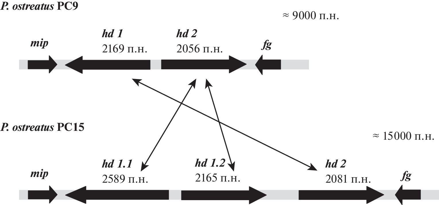The edible oyster mushroom Pleurotus ostreatus is one of the most cultivated species worldwide. Morphogenesis associated with the fruit bodies maturation is controlled by two unlinked loci of sexual compatibility matA and matB with multiple alleles (tetrapolar system of sexual compatibility). Quantitative analysis of the alleles of mating compatibility loci in 17 natural isolates collected in the Moscow region was performed in mon-mon (monokaryon – monokaryon) and di-mon (dikaryon – monokaryon) crossings. Four monokaryotic testers strains which were heteroallelic at both mating type loci were obtained for each of the five natural mushroom isolates by using original technique of sterile spore prints on Petri dishes and mon-mon crossing. Twelve natural isolates were crossed via di-mon mating with the four monokaryotic testers M-38. Genetic analysis of the alleles of sexual compatibility loci in 17 natural isolates revealed multiple alleles at both loci: at least 10 alleles at matA locus and eight alleles at matB locus. Structural organization analysis of the matA locus was performed in silico for homokaryotic strains PC9 and PC15 based on the genome sequencing data available at DOE Joint Genome Institute. The matA locus is proved to be of extremely divergent structure: there are one copy of the homeodomain gene hd1 and one copy of the hd2 gene in the PC9 strain, whereas the matA locus of the PC15 strain is composed by two copies of hd1.1 and hd1.2 genes (class HD1 homeodomain proteins) and one copy of hd2 gene (class HD2 proteins). Comprehensive analysis of amino acid sequences of HD1 and HD2 homeodomain proteins demonstrated that the proteins have a globular structure with the nuclear localization and contain a variable N-terminus and the more conservative DNA-binding domain with a specific conservative motif WFXNXR in the third ɑ-helix. The results approve the opinion that multiple alleles of the matA locus of sexual compatibility in basidiomycete fungi is achieved by different copies’ number of the coding hd genes within the locus, as well as by the variability of the coding gene sequences.