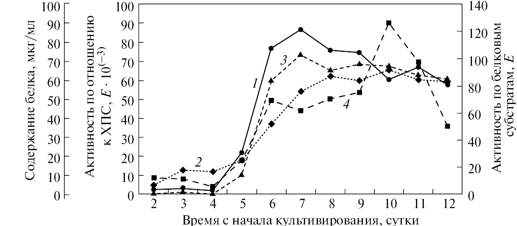 Для выяснения влияния условий культивирования на продукцию протеаз культивировали штамм-продуцент на двух ферментационных средах и измеряли концентрацию белка, азоказеинолитическую и амидолитическую активности аликвот культуральной жидкости, отобранных каждые 24 ч, начиная с конца вторых суток культивирования. Культивирование проводили до заметного снижения протеолитической активности культуральной жидкости. По результатам эксперимента выбирали наиболее подходящую среду и оптимальное время культивирования продуцента.
