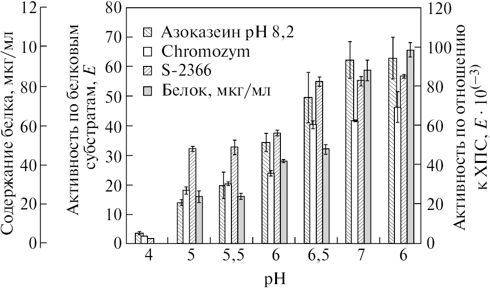 Исследование влияния рН и температуры на продукцию протеаз A. tabacinus проводили при культивировании на ферментационной среде 2 в течение семи суток. Было обнаружено, что оптимальным начальным значением рН среды культивирования является 7–8 (рис. 3). При увеличении начального рН среды от 4 до 8 наблюдается возрастание всех измеренных показателей: концентрации белка в семидневной культуральной жидкости, азоказеинолитической активности и активностей по отношению к Chromozym TH и S-2236. Однако между показателями для рН 7 и для рН 8 нет достоверной разницы.