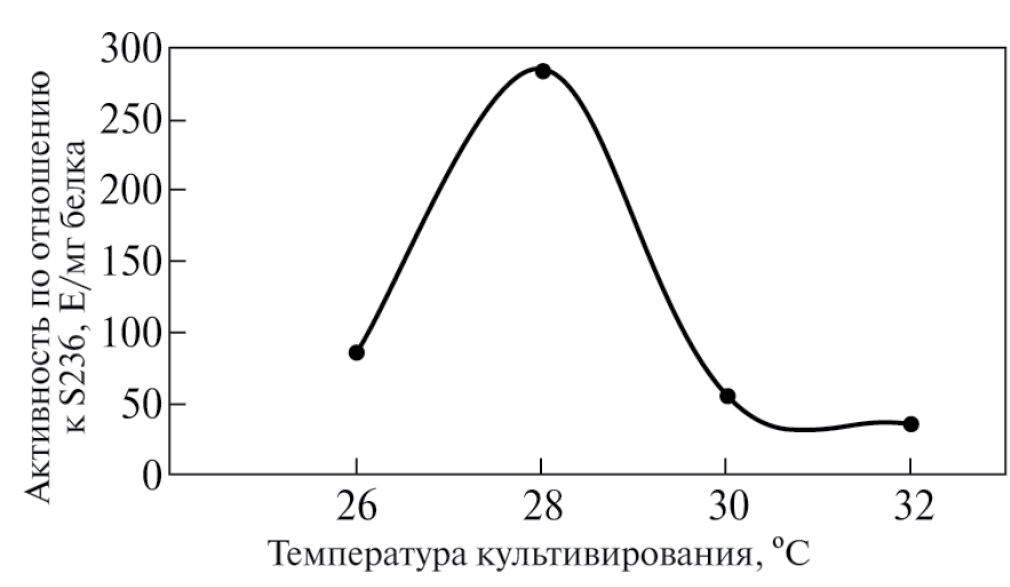 Влияние температуры на продукцию протеаз A. tabacinus исследовали с использованием ферментационной среды 2, начальное значение рН которой составляло 7. Спустя семь суток культивирования измеряли концентрацию белка в среде и активность по S-2366, далее рассчитывали удельную активность протеаз культуральной жидкости по данному субстрату. Было обнаружено, что оптимальной температурой для продукции протеаз является 28օC (рис. 4).