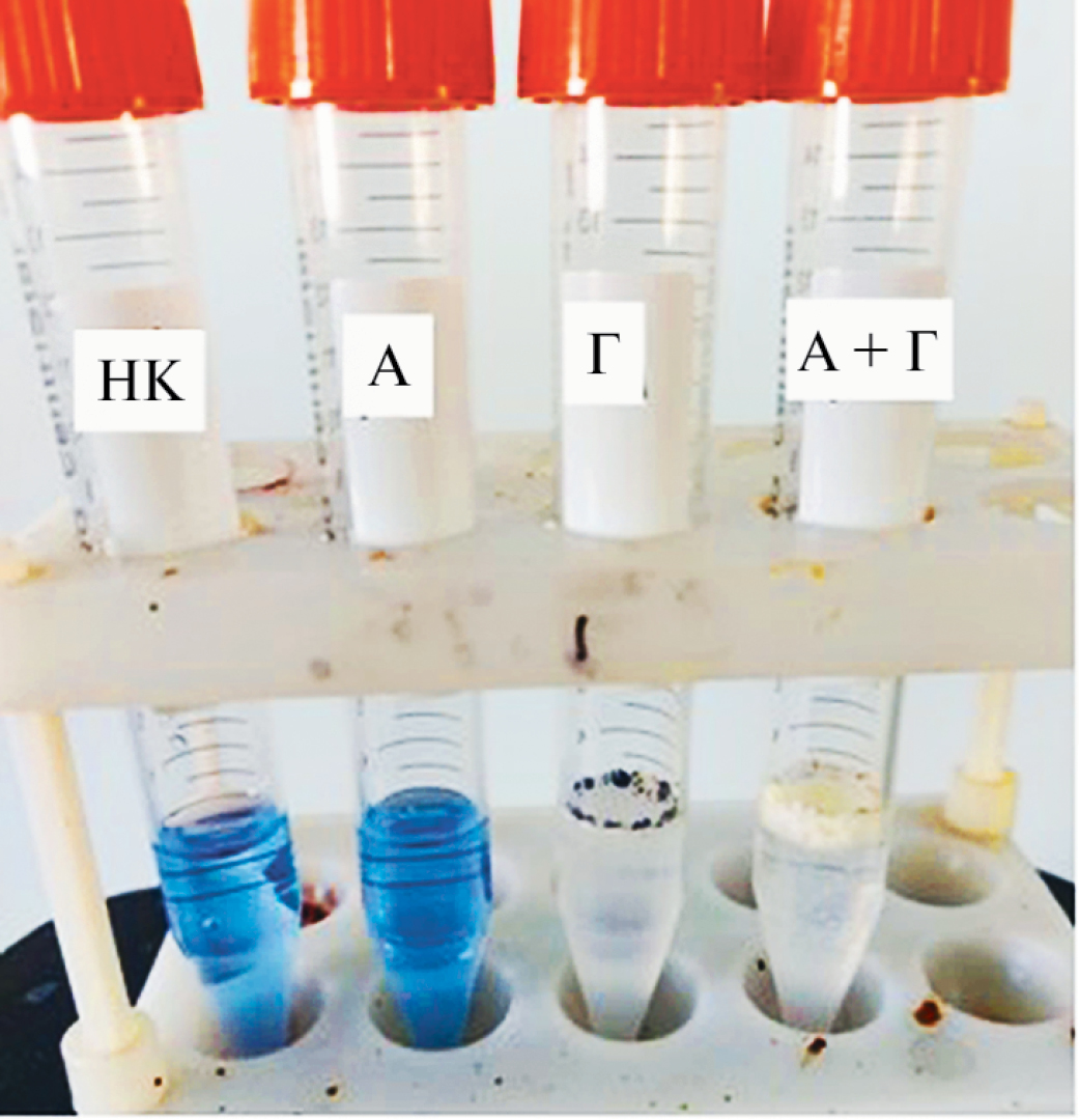 Рис. 3. Рост Aspergillus niger АМ1 на ацетонитриле: А – ацетонитрил; Г – глюкоза; НК – негативный контроль. Голубая окраска окисленного 2,6-дихлорфенолиндофенола свидетельствует об отсутствии метаболических процессов. Отсутствие окраски у восстановленного красителя свидетельствует о жизнедеятельности A. niger. Снимок сделан на 26-е сут после посева.