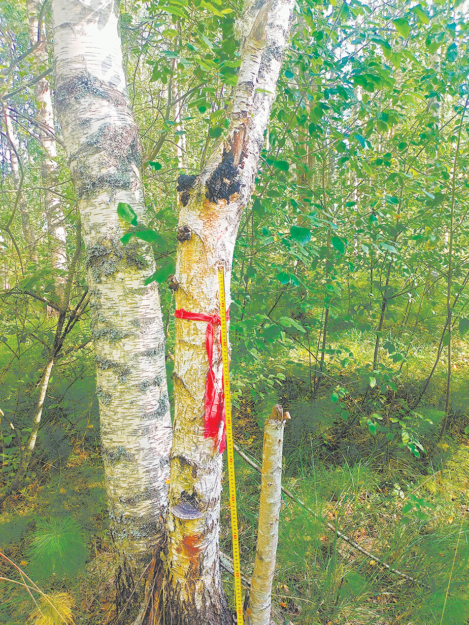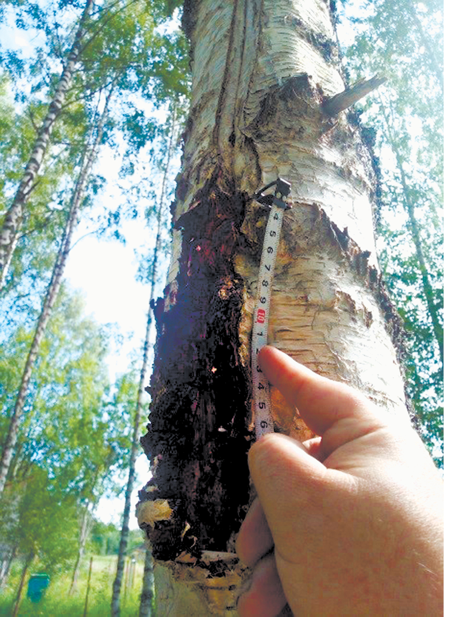 Некоторые деревья, помимо видимого поражения Inonotus obliquus, как оказалось, были естественным образом инфицированы ложным трутовиком (Phellinus nigricans) (рис. 3). Интересно отметить, что береза, ствол которой несет наибольшее количество наростов чаги, также поражена Ph. nigricans.