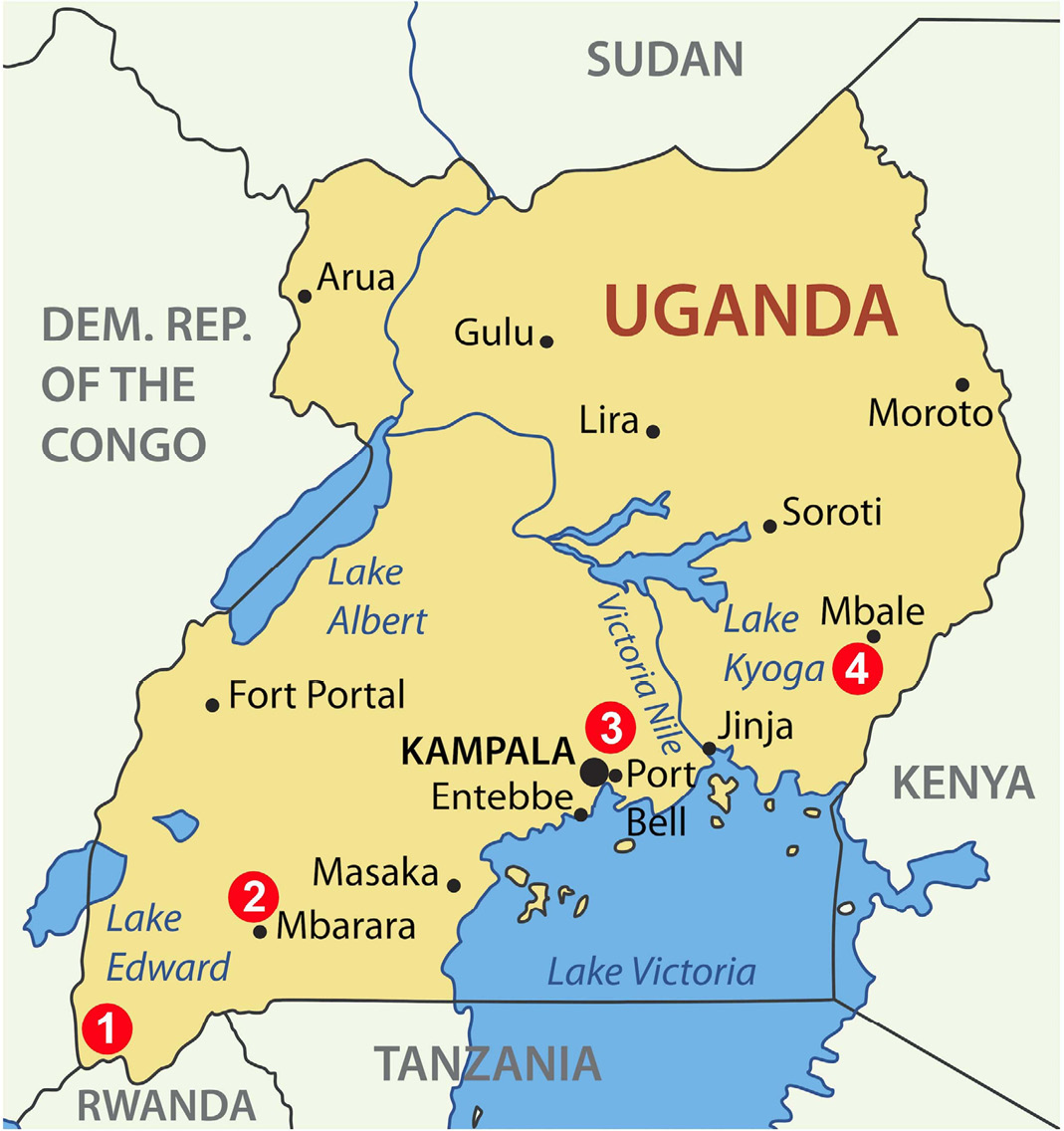 Fig. 1. Samples of infected potato tubers and tomato fruits were collected samples were collected in the southwest (1, 2), center (3) and east (4) of Uganda.