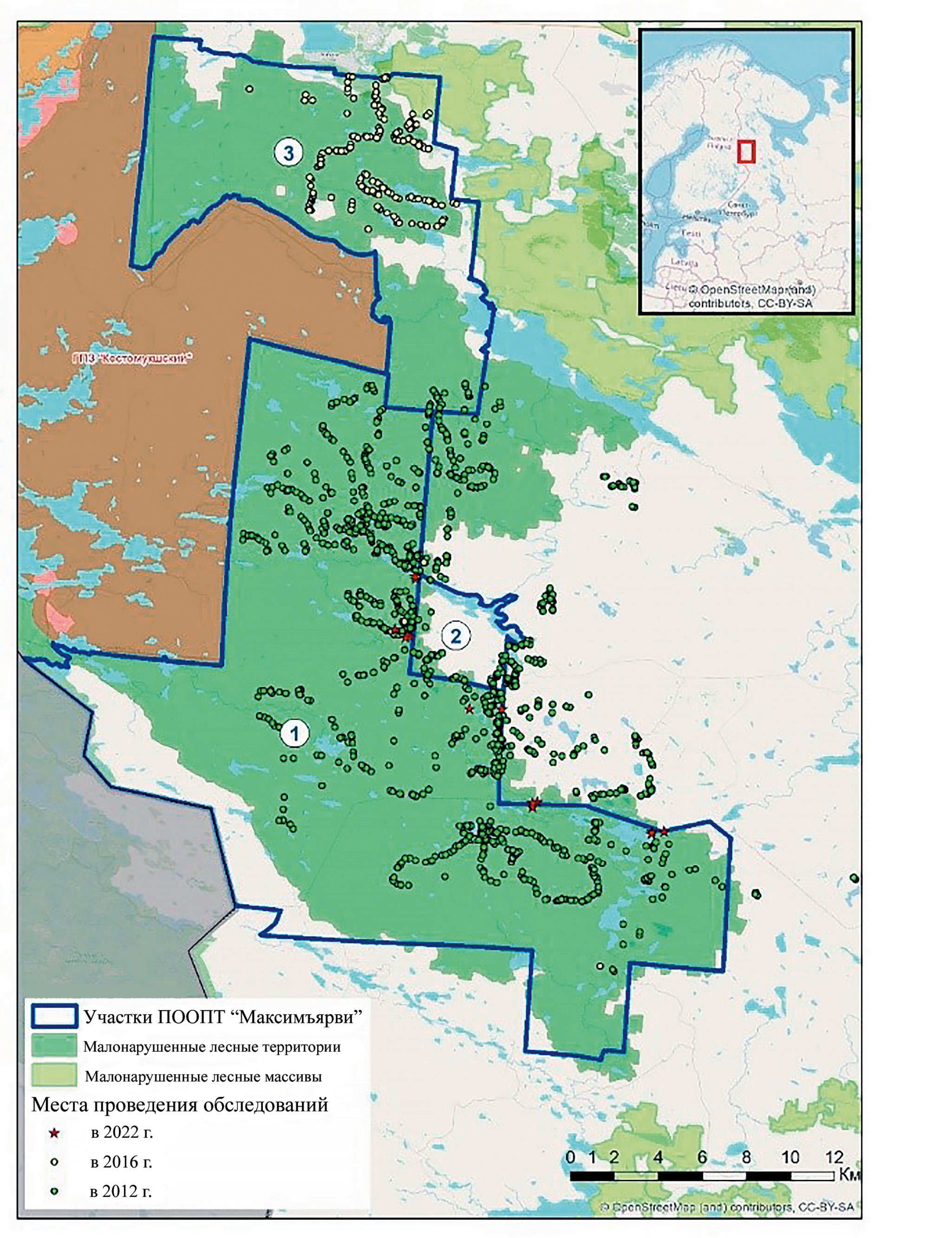 Планируемая особо охраняемая природная территория (ПООПТ) “Максимъярви” площадью около 40 тыс. га находится в северной части Республики Карелия в Муезерском районе и на территории Костомукшского городского округа (рис. 1), в денудационно-тектоническом холмисто-грядовом среднезаболоченном ландшафте с преобладанием сосновых местообитаний (Gromtsev et al., 2011). На ПООПТ отсутствуют населенные пункты, дорожная сеть минимальная, состоит из дороги вдоль границы с Финляндией и лесовозных дорог. Сохранившиеся на ПООПТ эталонные высоковозрастные северотаежные сообщества – это один из последних крупных участков в Республике Карелия, практически не преобразованных деятельностью человека. Сосняки являются самыми распространенными типами леса ПООПТ; меньшую площадь занимают ельники, приуроченные в основном к склонам, ложбинам (межгрядовые и межхолмовые понижения), ручьям. Леса образованы сосной обыкновенной (Pinus sylvestris L.), елью европейской [Picea abies (L.) H. Karst.], березой (Betula spp.), осиной (Populus tremula L.), ивой (Salix spp.), ольхой (Alnus spp.). Возраст сосны и ели составляет более 200 лет. Наиболее ценная часть обследованной территории – участок № 1 (рис. 1). Участок № 2 включает оз. Максимъярви и прилегающую территорию. На участках № 2 и 3 продолжаются вырубки леса, и они фрагментированы.