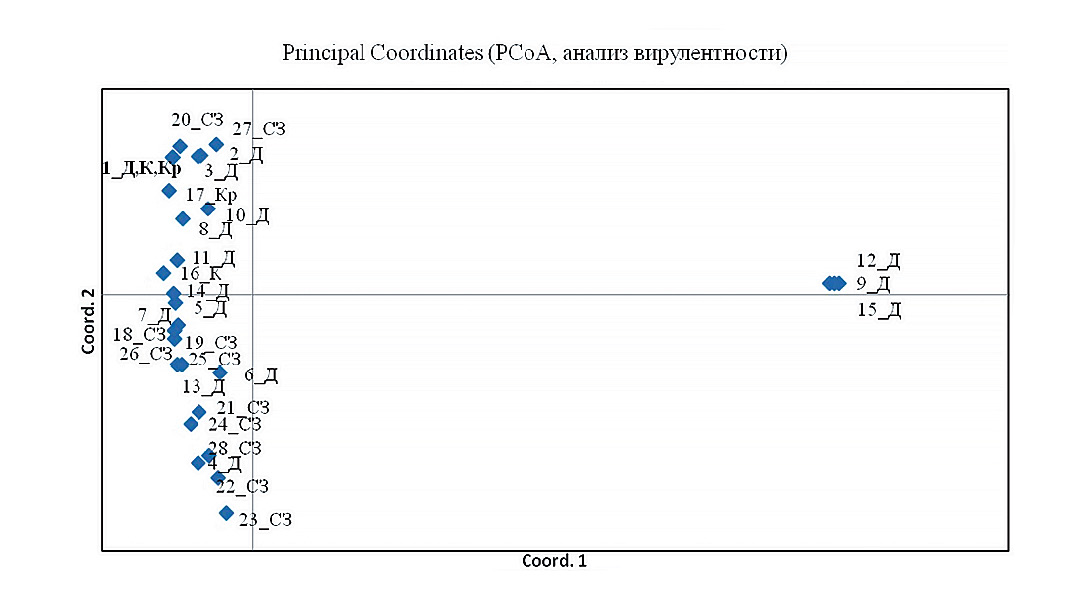 Показатели внутрипопуляционного разнообразия изученных популяций по признаку вирулентности представлены в табл. 2. 28 фенотипов (рас) определено в региональных коллекциях изолятов. Наибольшее число фенотипов (15) выявлено в дагестанской популяции. Частота доминирующего фенотипа составила 14%. 11 фенотипов встречались с частотой 7%. Три фенотипа были единичными (один фенотип – один изолят). В северо-западной популяции выявлено 11 фенотипов, среди них два были наиболее представленными (27 и 13%). Другие девять фенотипов встречались с частотой 7%. В краснодарской Pst коллекции определено три фенотипа (частота 70, 20 и 10%), в калмыцкой – два (частота 80 и 20%). Один общий фенотип выявлен в дагестанской, краснодарской и калмыцкой популяциях. Оценили генетическое родство между фенотипами (опция Genetic distance, GenAlex). На многомерной диаграмме (рис. 1) большинство из них сгруппировались в один кластер, за исключением трех дагестанских фенотипов с наименьшим числом аллелей вирулентности.